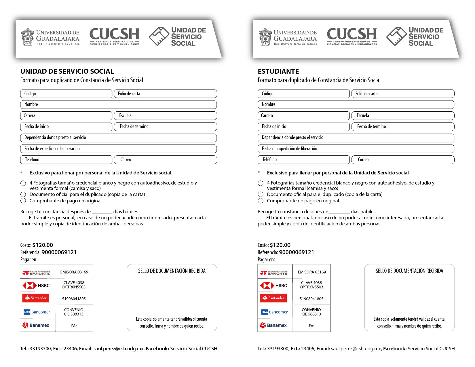 - Por la cantidad de 120 pesos a la referencia bancaria de la Universidad de Guadalajara número 90000069121 (podrás encontrar el formato en la parte inferior de está página)