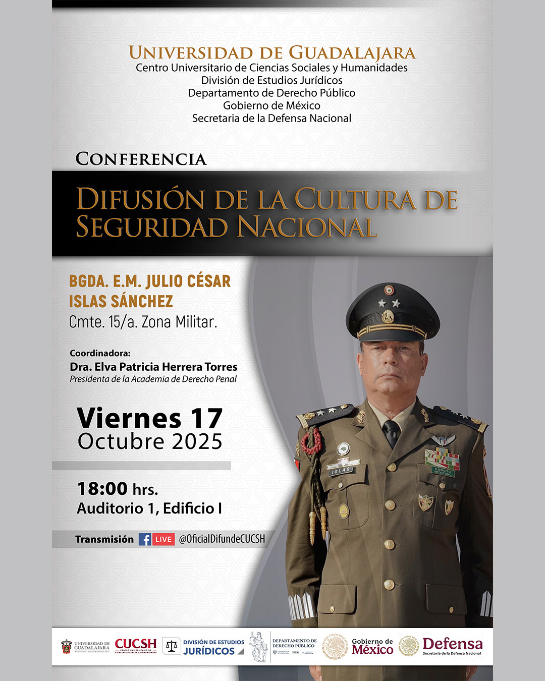 La Universidad de Guadalajara, a través del Centro Universitario de Ciencias Sociales y Humanidades (CUCSH), la División de Estudios Jurídicos y el Departamento de Derecho Público, en coordinación con la Secretaría de la Defensa Nacional, te invitan a esta importante conferencia impartida por: