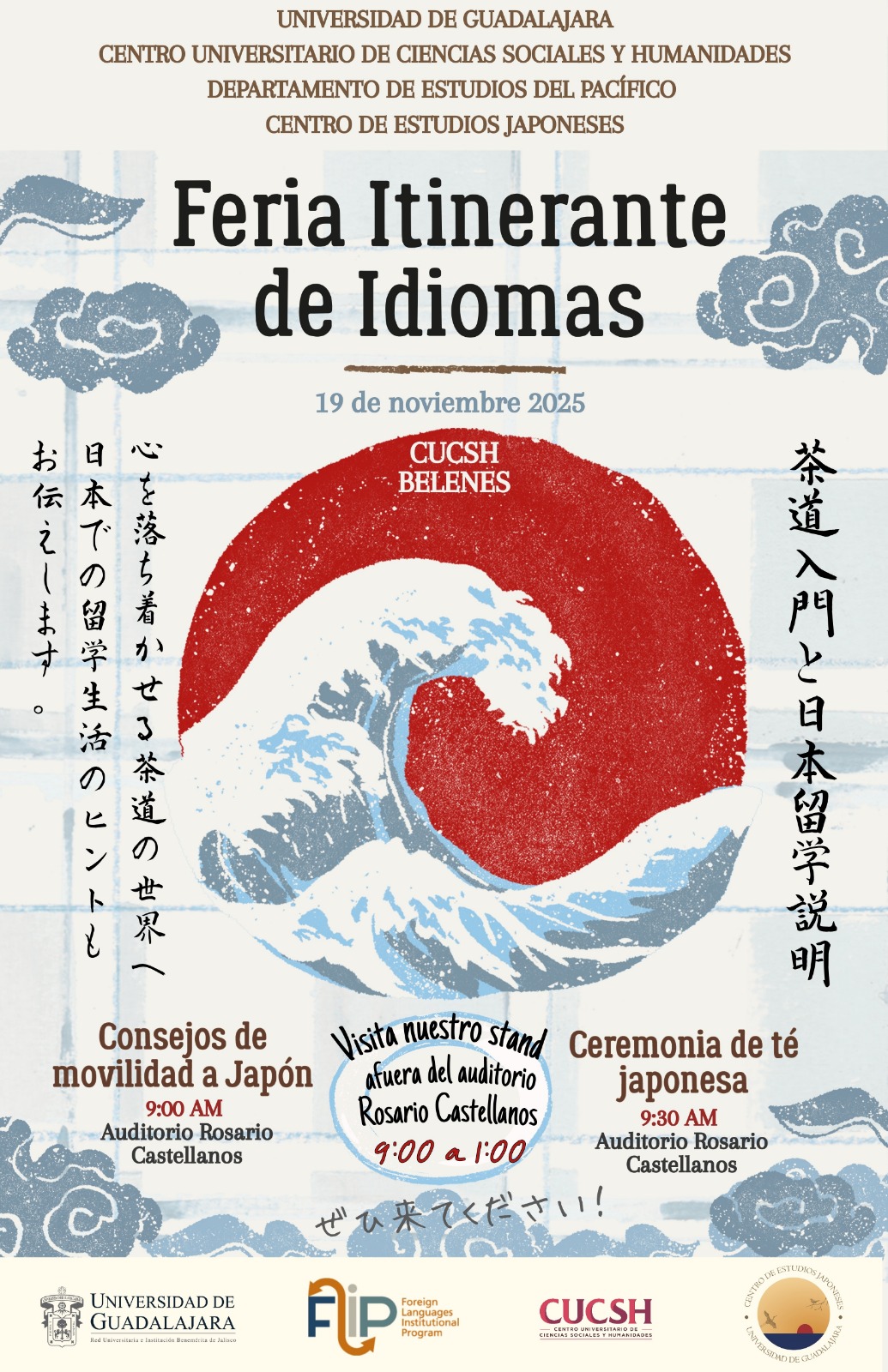 El Centro de Estudios Japoneses del Departamento de Estudios del Pacífico, perteneciente al Centro Universitario de Ciencias Sociales y Humanidades (CUCSH) de la Universidad de Guadalajara, invita a la comunidad universitaria a participar en las actividades que realizará dentro de la Feria Itinerante de Idiomas 2025.  Programa de actividades