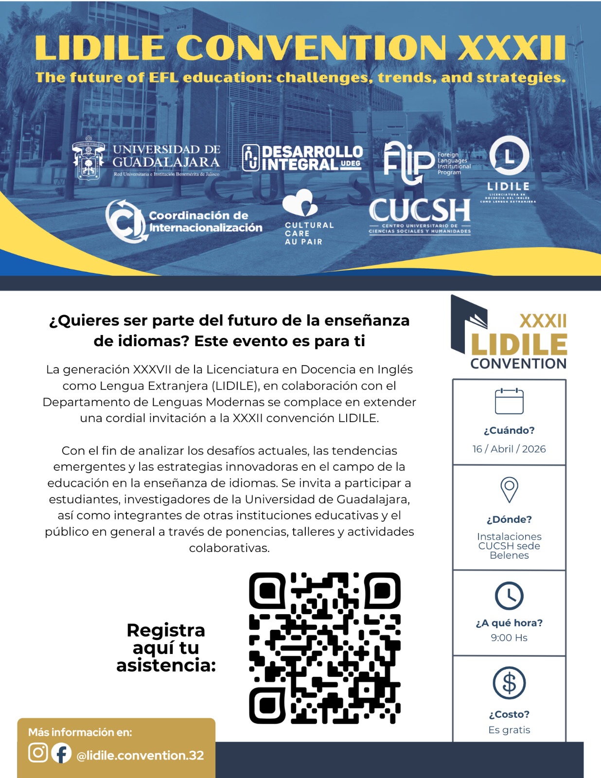 La generación XXXVII de la Licenciatura en Docencia en Inglés como Lengua Extranjera (LIDILE), en colaboración con el Departamento de Lenguas Modernas, extiende una cordial invitación a la XXXII Convención LIDILE.