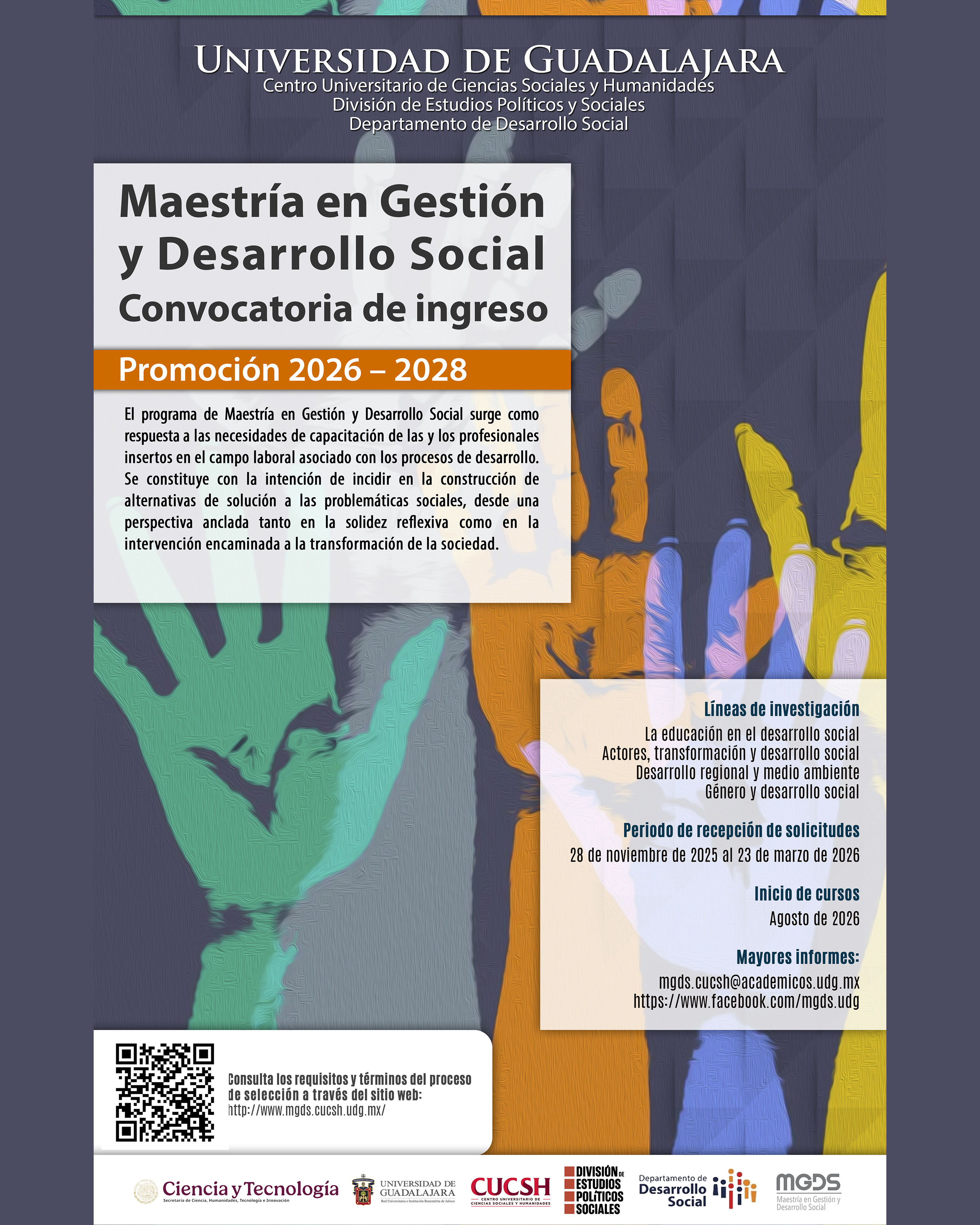 El Centro Universitario de Ciencias Sociales y Humanidades (CUCSH) dio a conocer la convocatoria de ingreso para la Maestría en Gestión y Desarrollo Social, programa que forma parte de la División de Estudios Políticos y Sociales y que se ha consolidado como un espacio académico orientado a la formación de profesionales capaces de analizar, intervenir y proponer soluciones a problemáticas sociales desde un enfoque interdisciplinario y reflexivo.