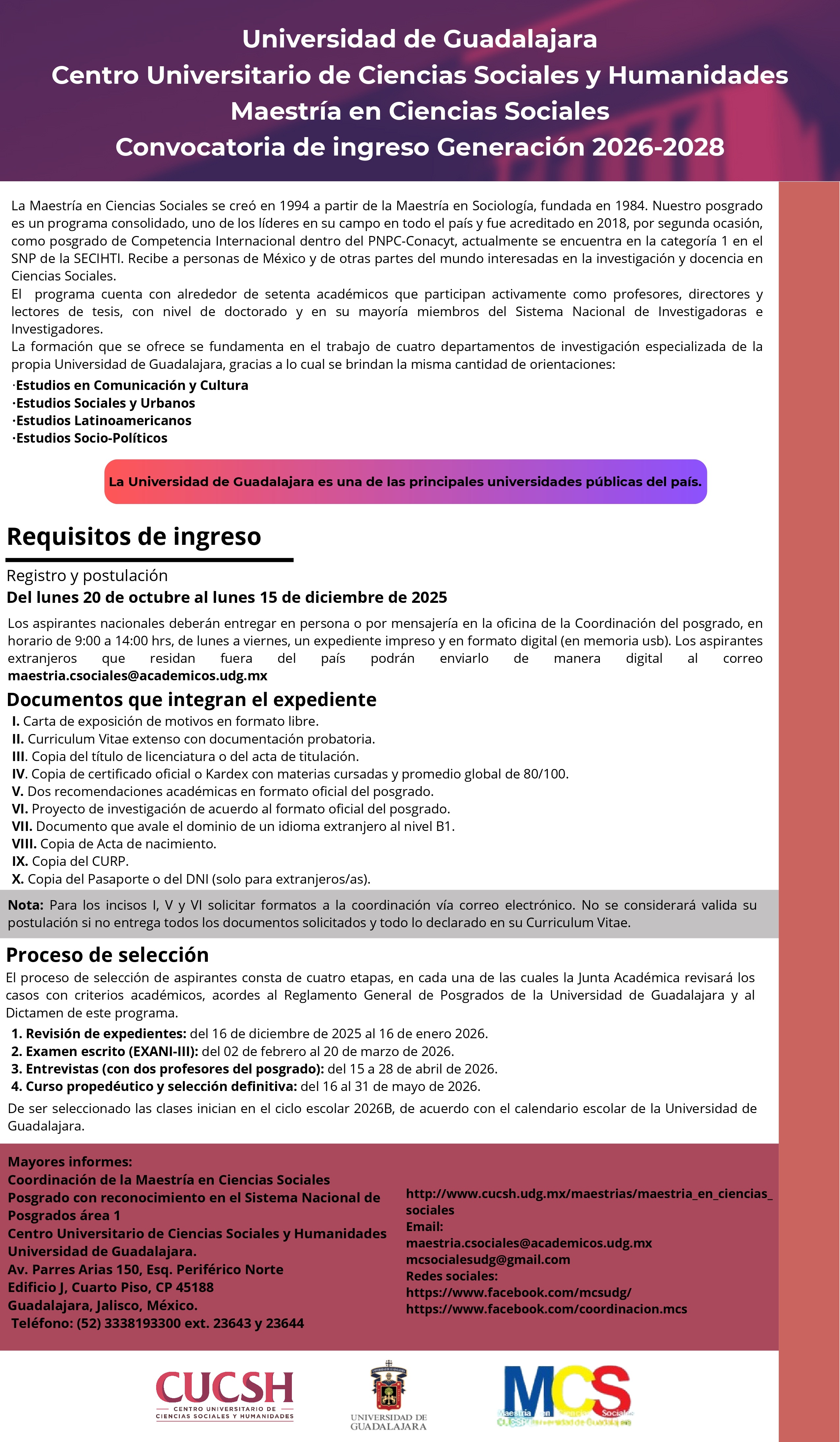 El Centro Universitario de Ciencias Sociales y Humanidades (CUCSH) de la Universidad de Guadalajara abrió la convocatoria de ingreso para la Maestría en Ciencias Sociales, correspondiente a la Generación 2026–2028.