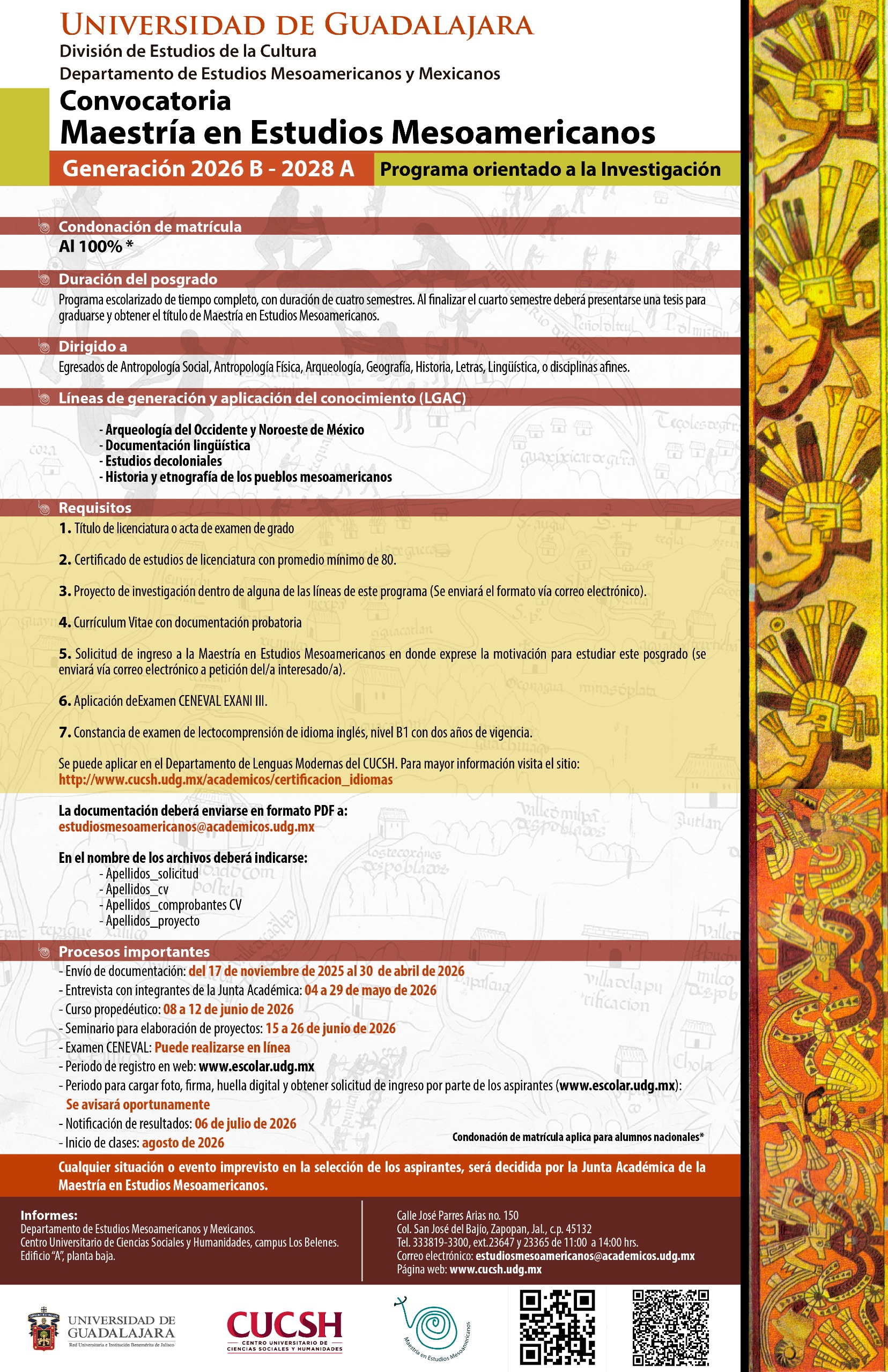 La Universidad de Guadalajara, a través de la División de Estudios de la Cultura y el Departamento de Estudios Mesoamericanos y Mexicanos del Centro Universitario de Ciencias Sociales y Humanidades (CUCSH), abrió la convocatoria para ingresar a la Maestría en Estudios Mesoamericanos, correspondiente a la generación 2026B–2028A.