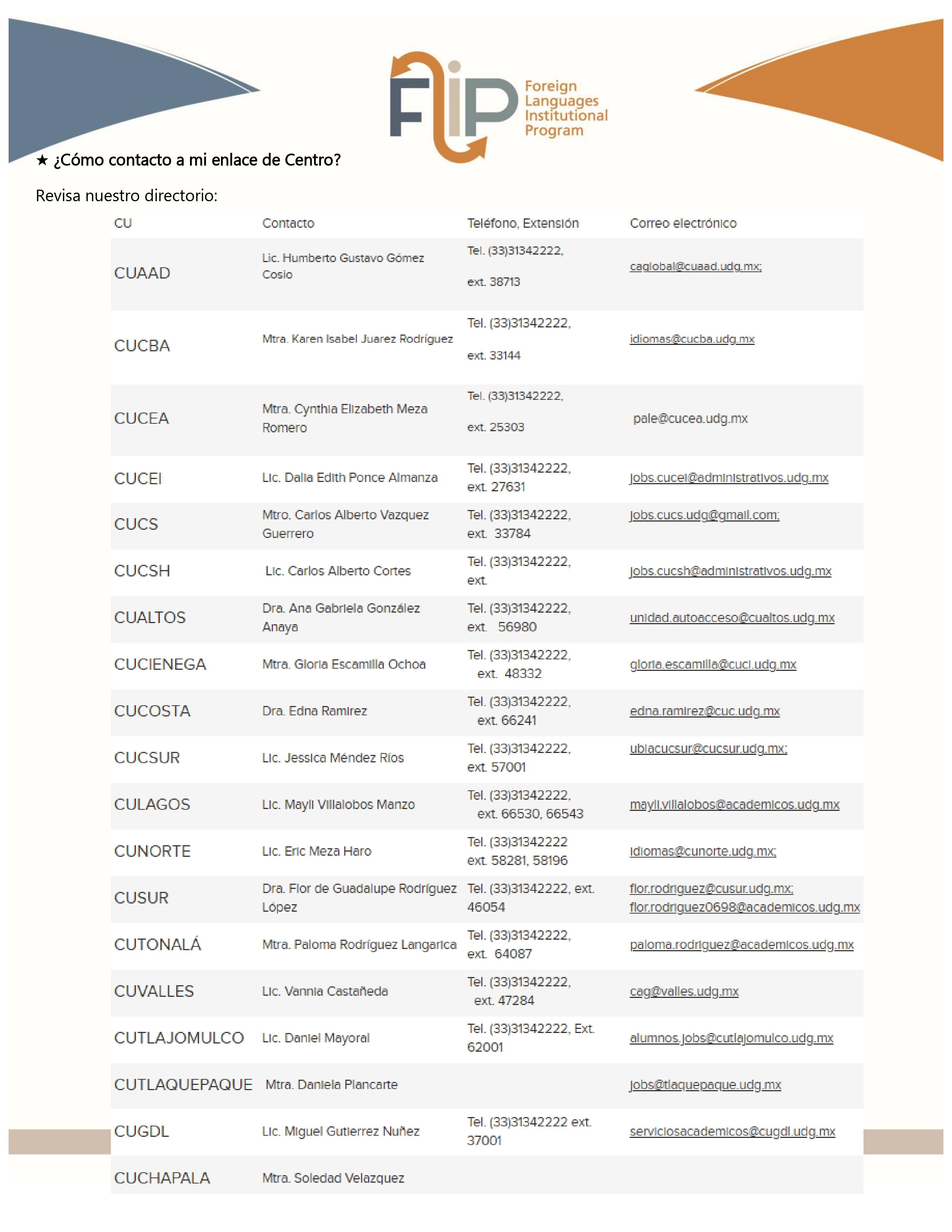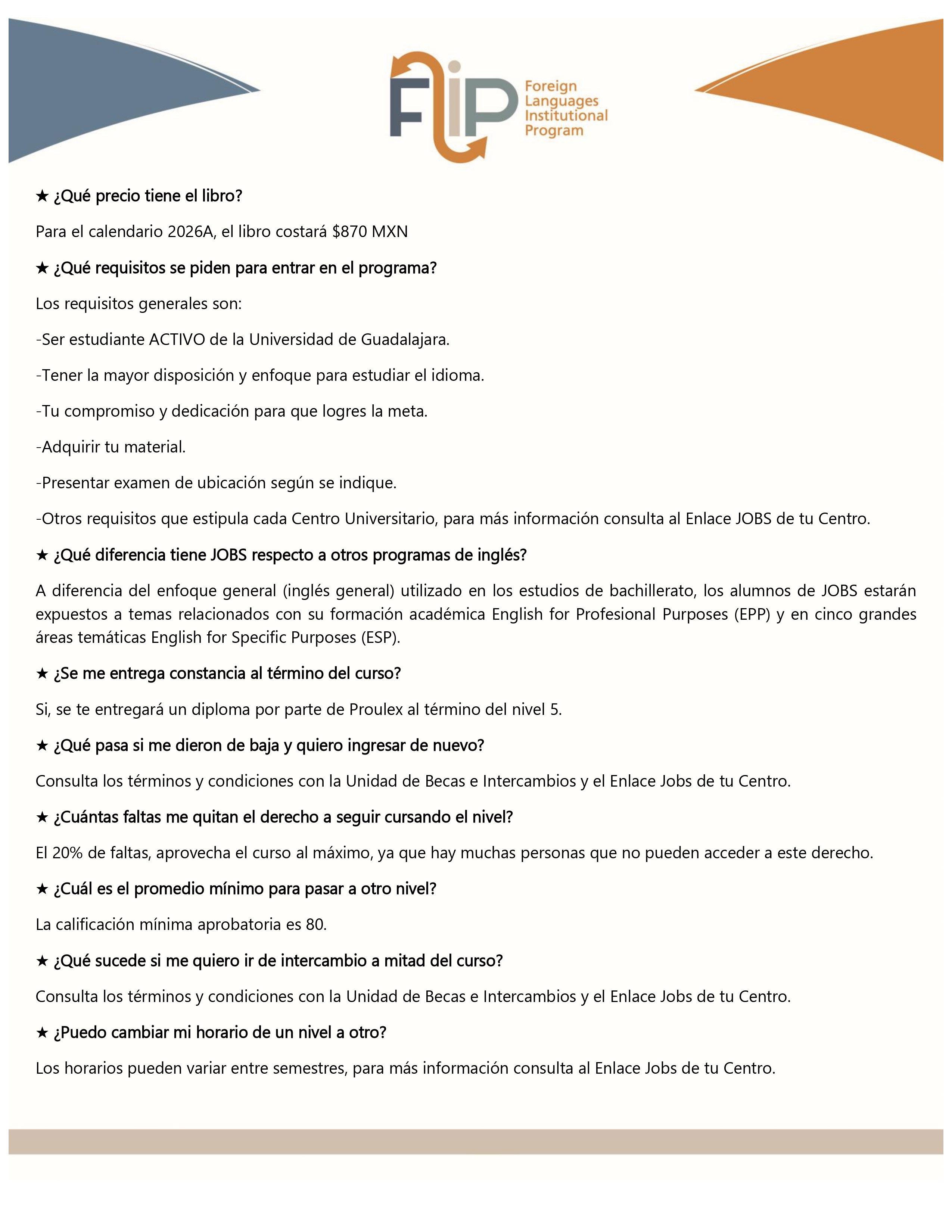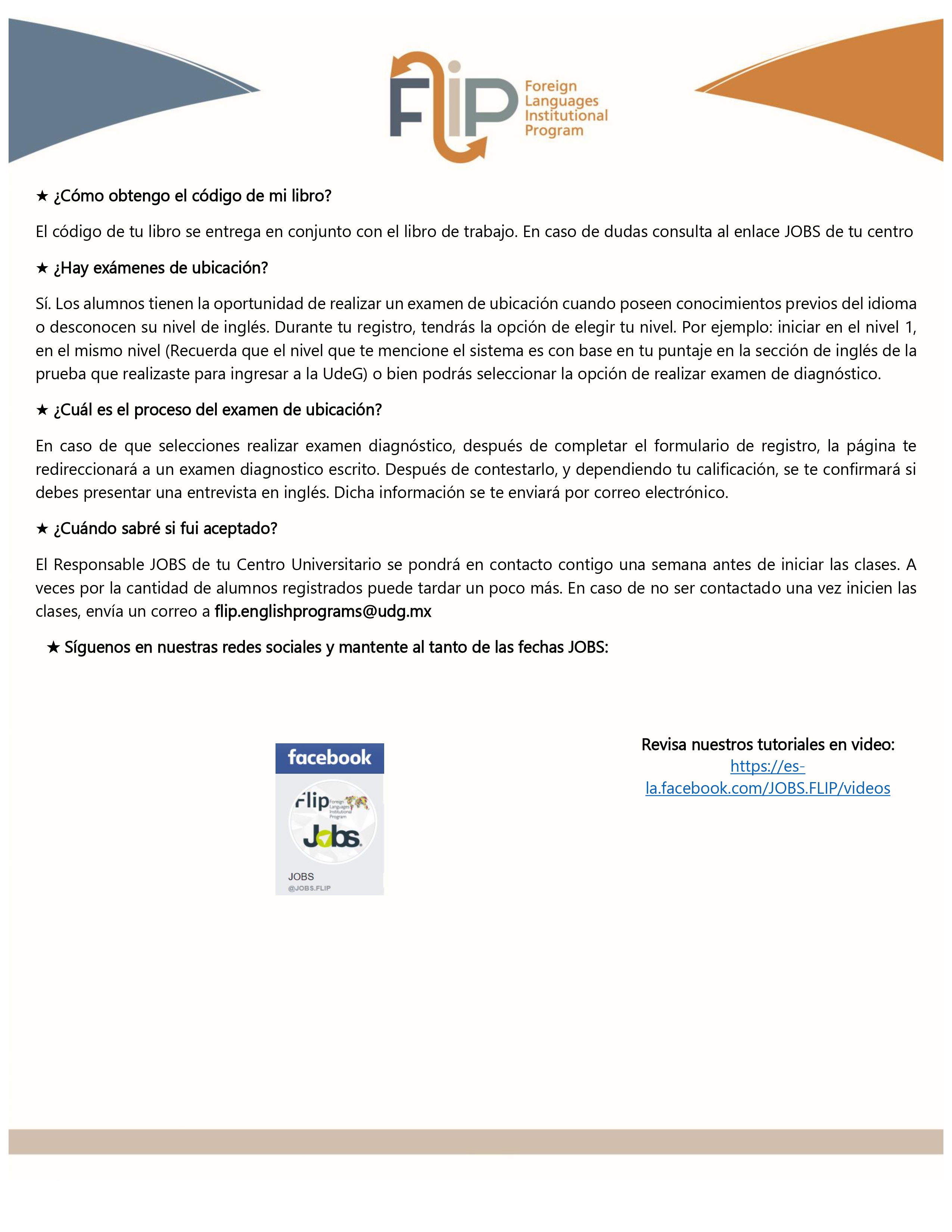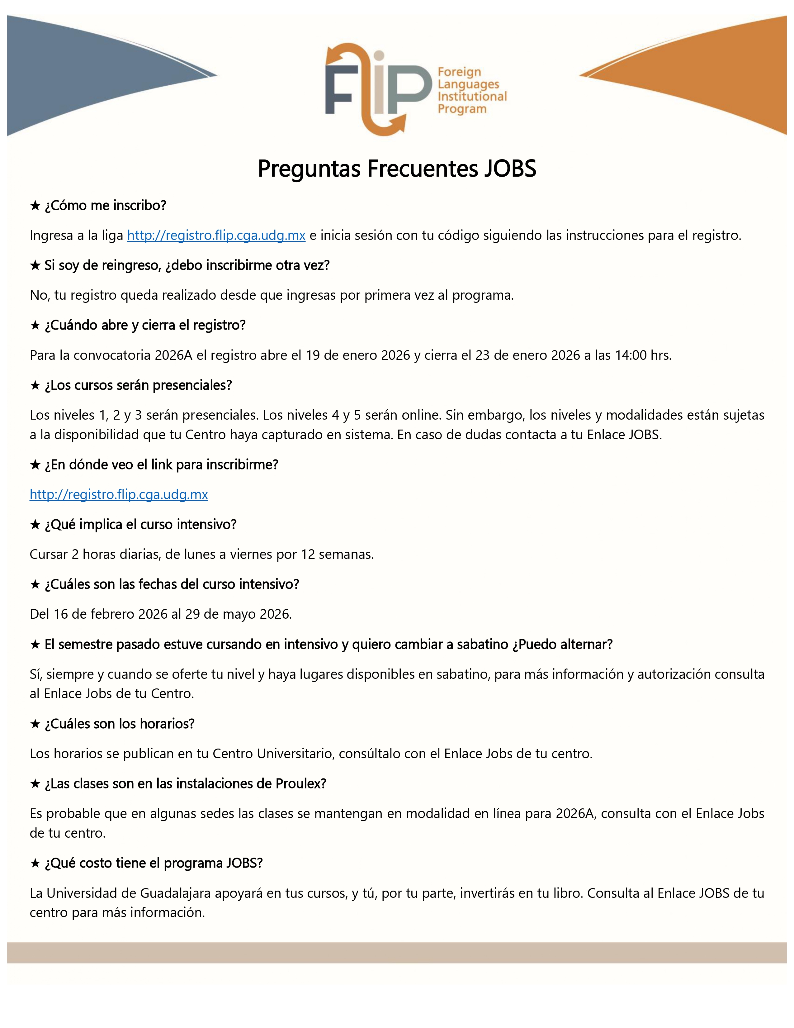 Las modalidades disponibles (presencial y/o en línea), así como información adicional, pueden consultarse en la plataforma de registro. Para dudas técnicas o apoyo con contraseñas, las y los estudiantes pueden comunicarse al correo flip.englishprograms@udg.mx o consultar las preguntas frecuentes en los canales oficiales de FLIP.