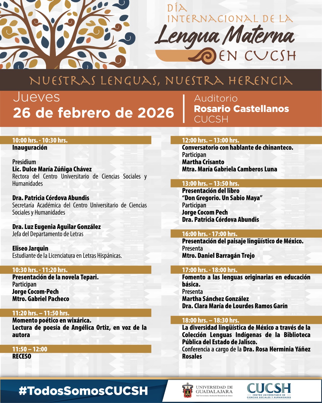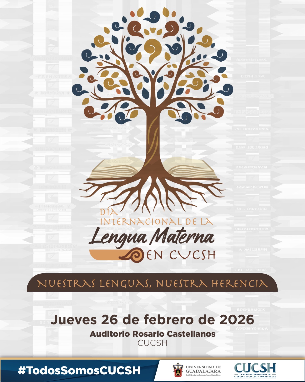 En el marco del Día Internacional de la Lengua Materna, el Centro Universitario de Ciencias Sociales y Humanidades (CUCSH) llevará a cabo la jornada titulada “Nuestras lenguas, nuestra herencia”, el próximo jueves 26 de febrero de 2026 en el Auditorio Rosario Castellanos.