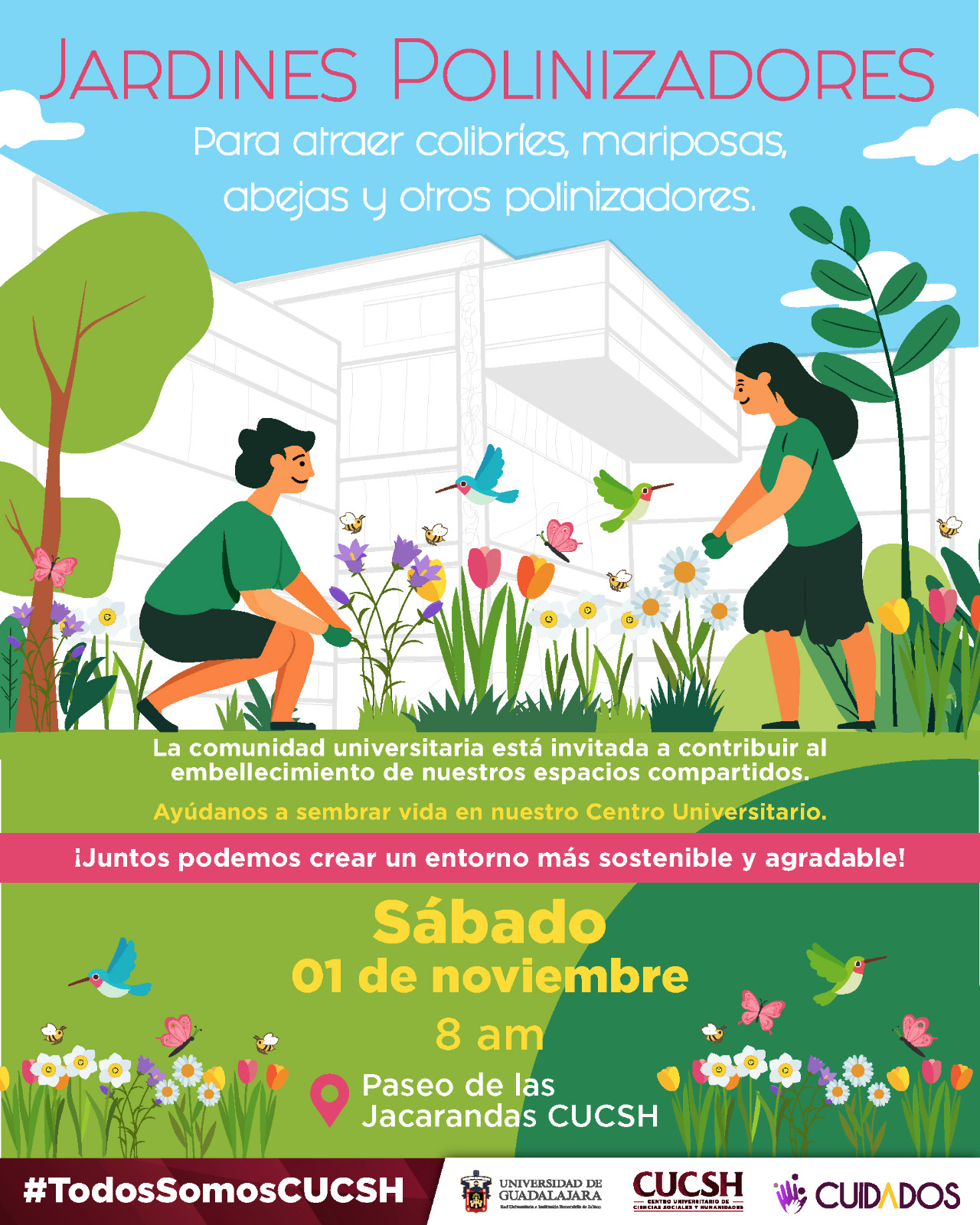 Con el objetivo de fomentar el cuidado del medio ambiente y el embellecimiento de los espacios universitarios, el Centro Universitario de Ciencias Sociales y Humanidades (CUCSH) invita a su comunidad a participar en la jornada “Jardines Polinizadores”, que se llevará a cabo el sábado 1 de noviembre a las 8:00 horas, en el Paseo de las Jacarandas.