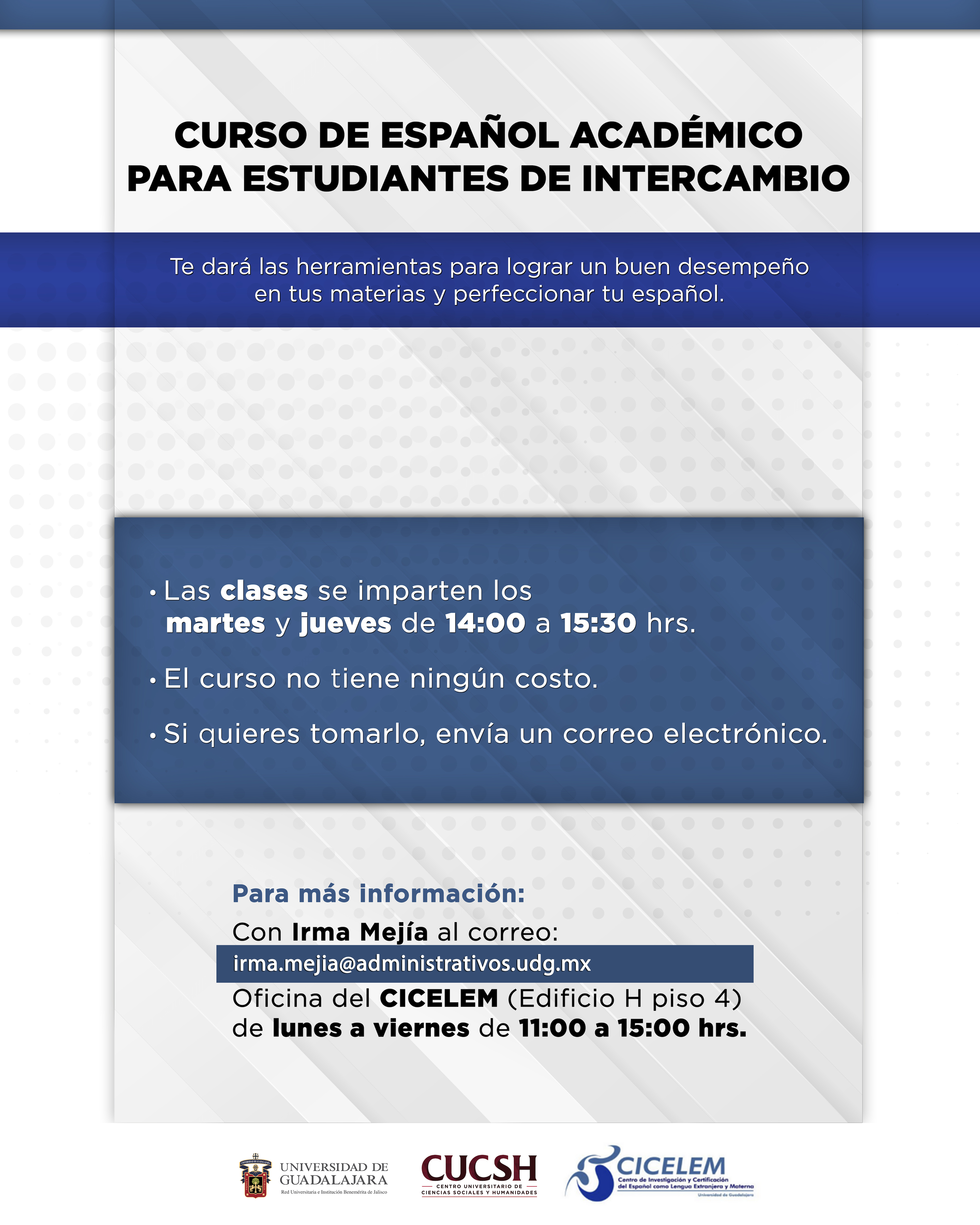 Oficina del CICELEM (Edificio H piso 4) de lunes a viernes de 11:00 a 15:00 hrs.