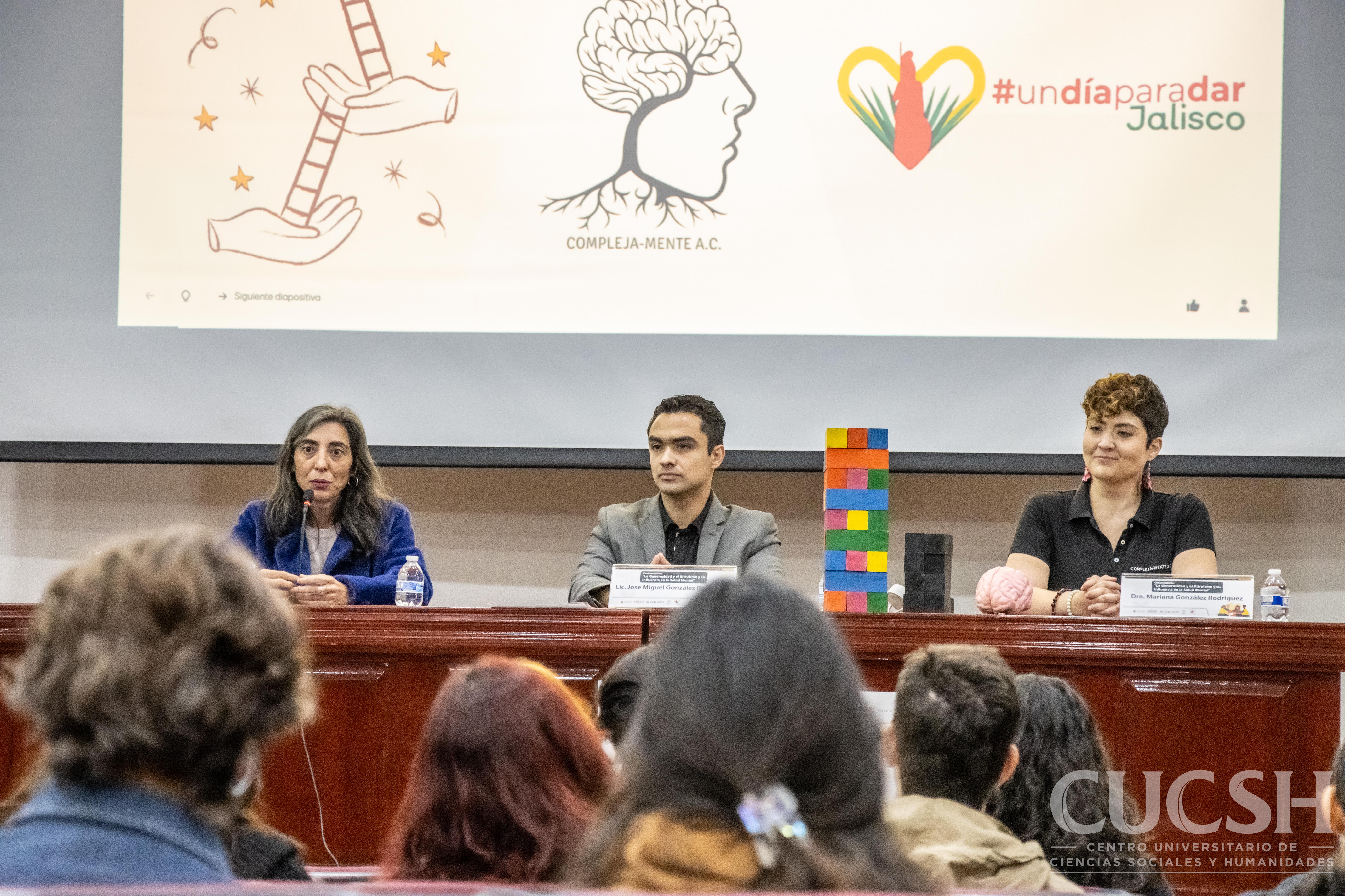 El evento se realizó en el Auditorio Rosario Castellanos del CUCSH, donde participaron la maestra Margarita Rodríguez Jiménez, coordinadora de Cuidados del centro universitario; el licenciado José Miguel González Rodríguez, gerente de desarrollo estratégico de COMPLEJA-MENTE A.C.; y la doctora Mariana González Rodríguez, presidenta de la asociación.