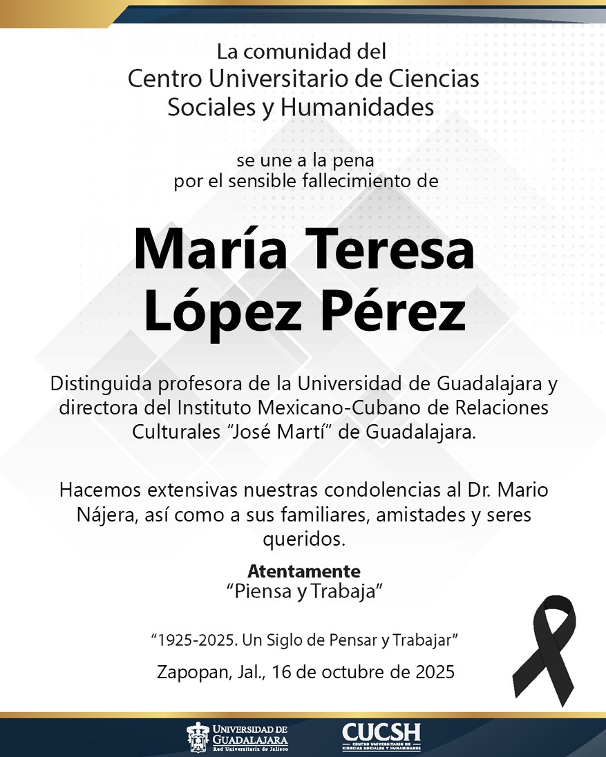 La comunidad del Centro Universitario de Ciencias Sociales y Humanidades lamenta profundamente el sensible fallecimiento de María Teresa López Pérez, distinguida profesora de la Universidad de Guadalajara y directora del Instituto Mexicano-Cubano de Relaciones Culturales “José Martí” de Guadalajara.