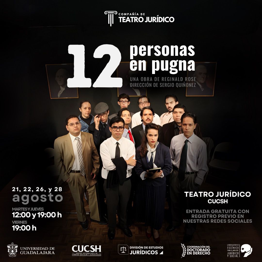La Compañía de Teatro Jurídico del CUCSH estrenará en agosto el montaje 12 personas en pugna, del dramaturgo estadounidense Reginald Rose, bajo la dirección de Sergio Quiñonez Rodríguez.