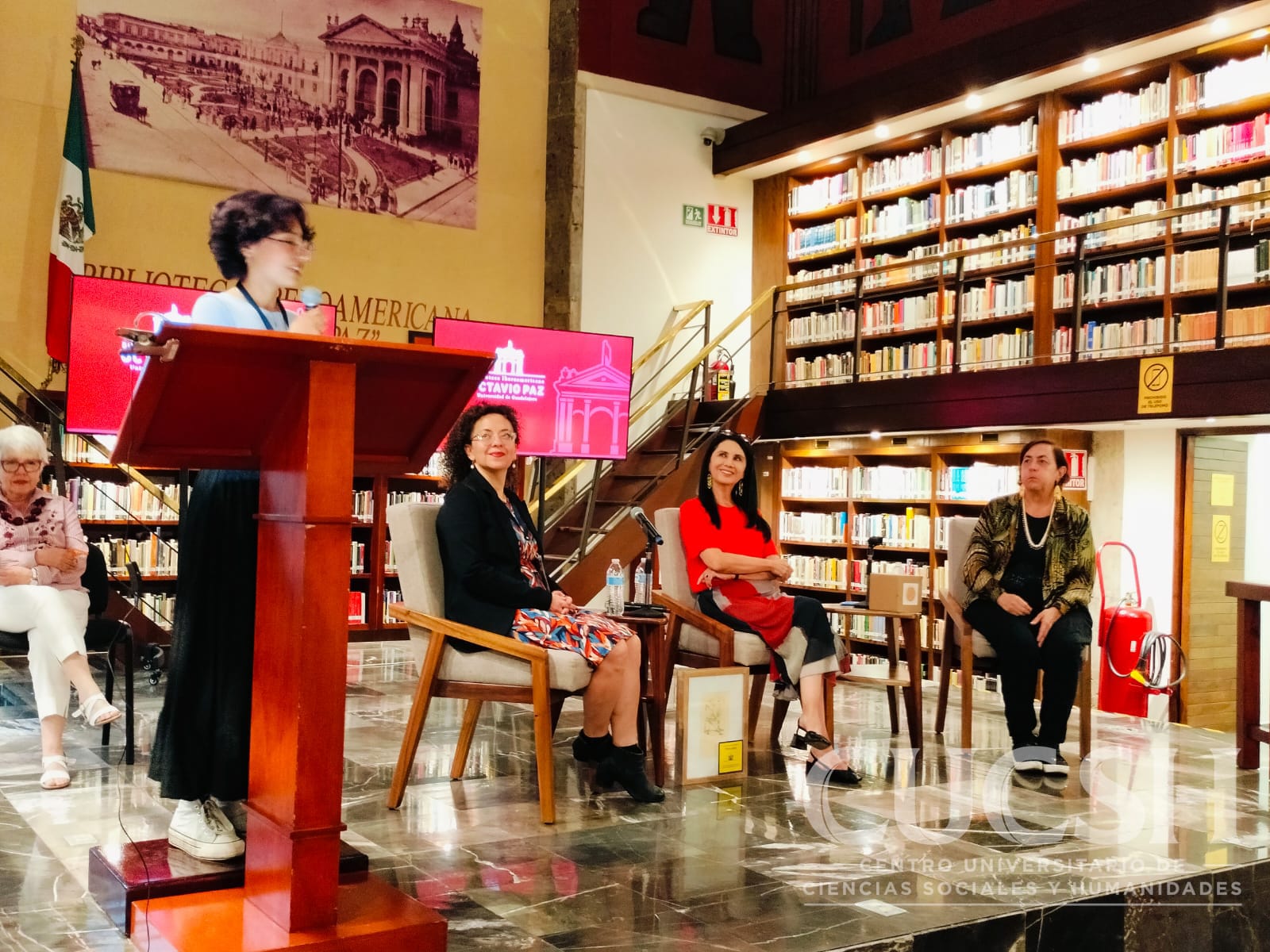 Como cierre del homenaje, Mariana Camacho Cruz, estudiante del CUCSH, hizo entrega de un reconocimiento artístico creado por el maestro Mario Martín del Campo, una pieza que simboliza “la pluma de la escritora y la alegría de volar de sus palabras”.