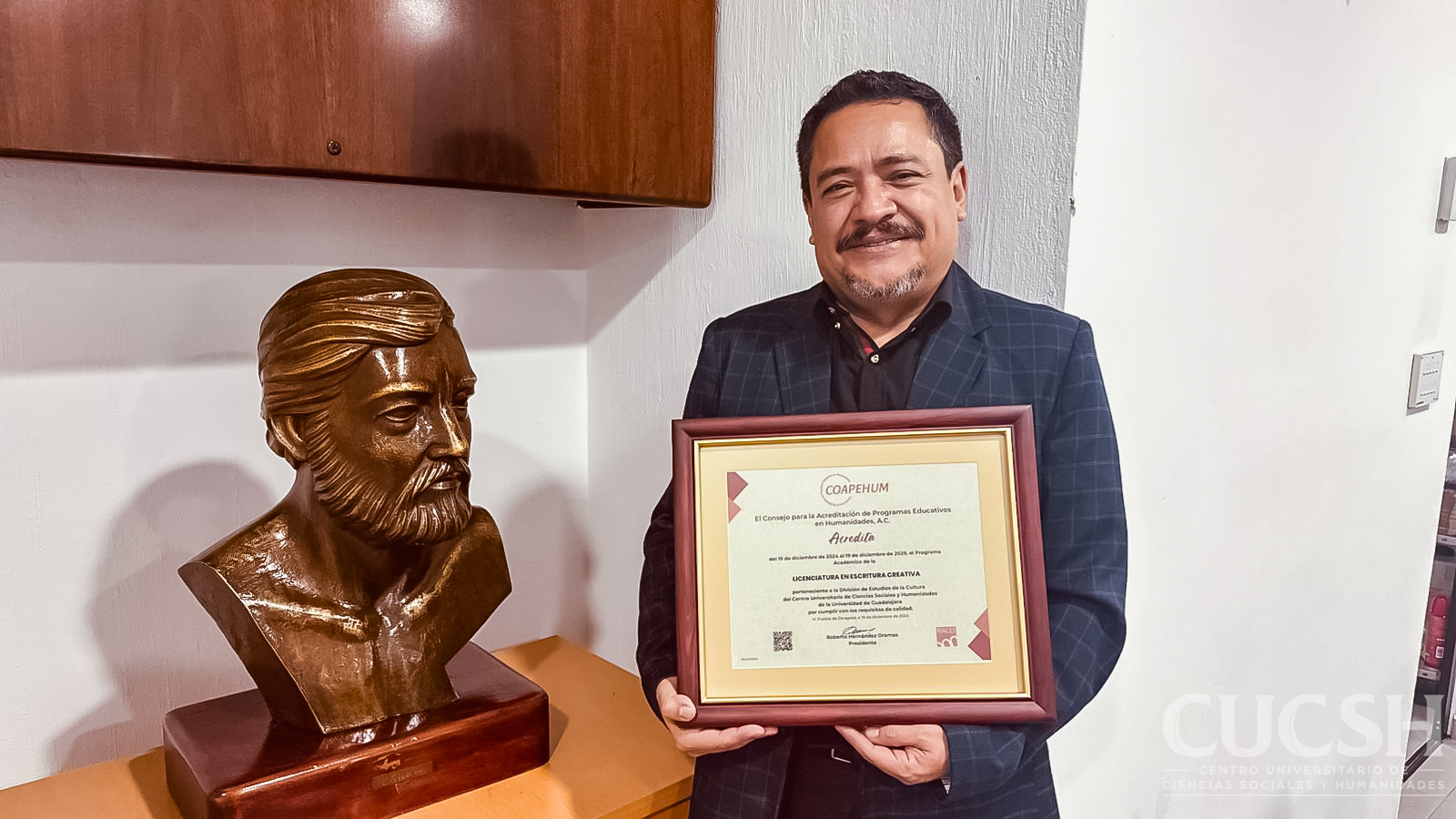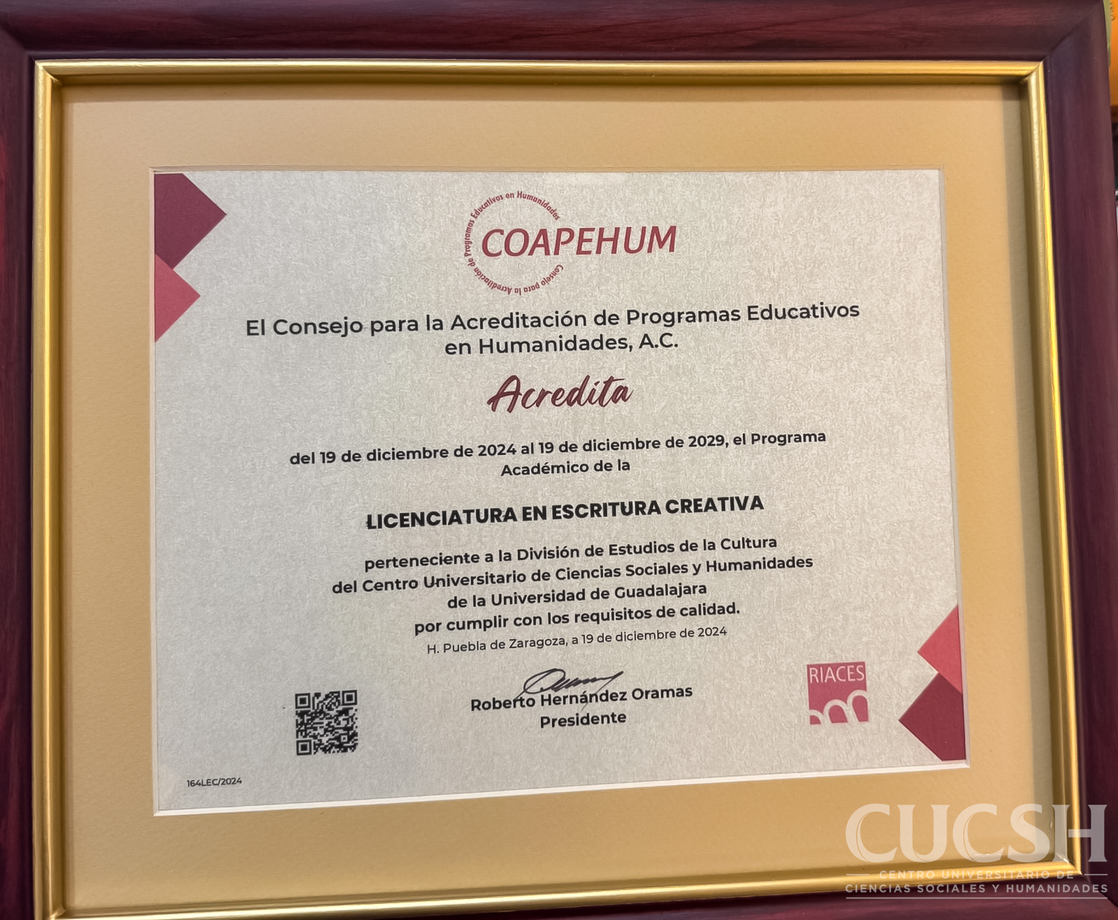 En una ceremonia realizada en el Centro Universitario de Ciencias Sociales y Humanidades (CUCSH) de la Universidad de Guadalajara, se llevó a cabo la entrega oficial de la constancia de acreditación de la Licenciatura en Escritura Creativa por parte del Consejo para la Acreditación de Programas Educativos en Humanidades (COPEHAUM).