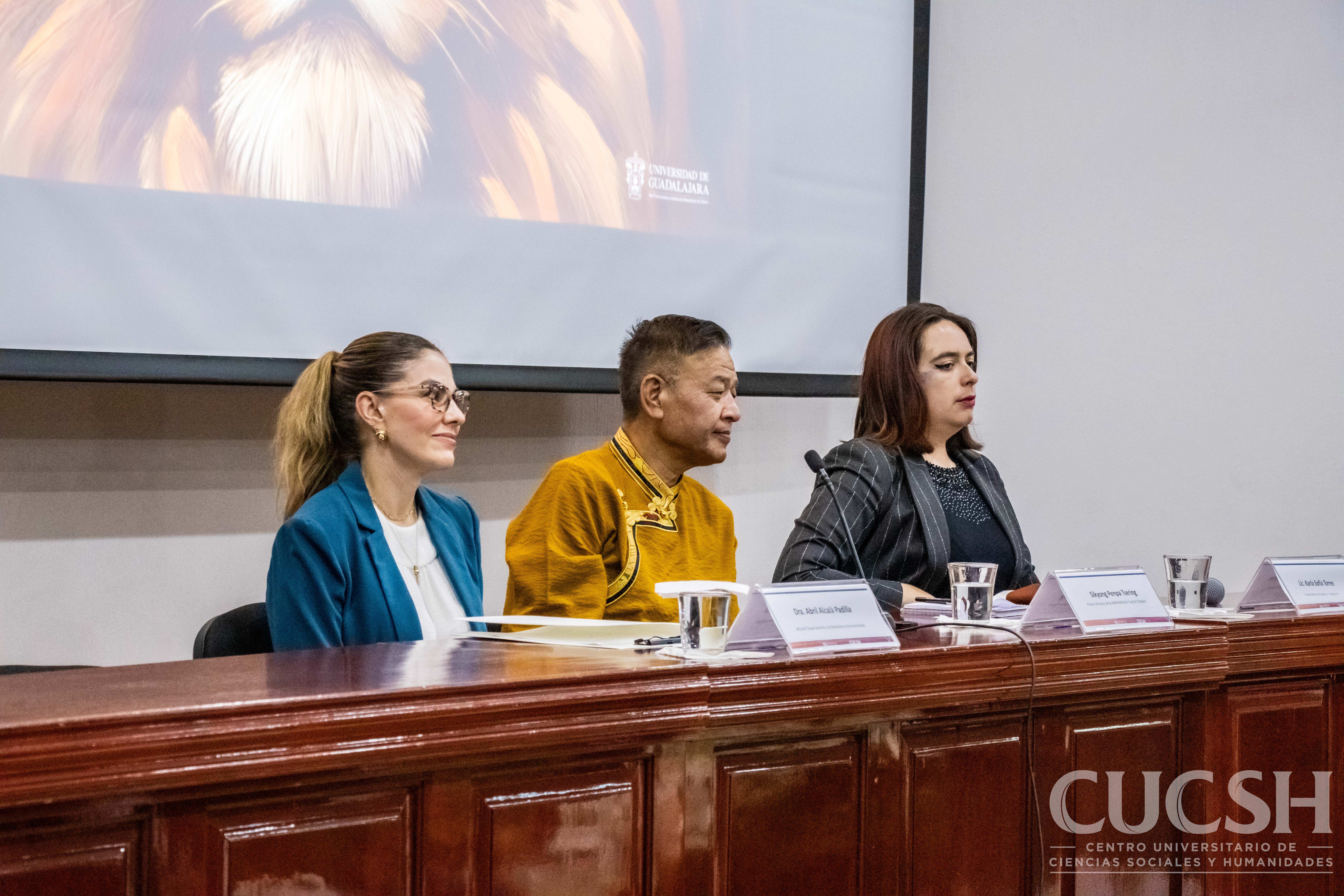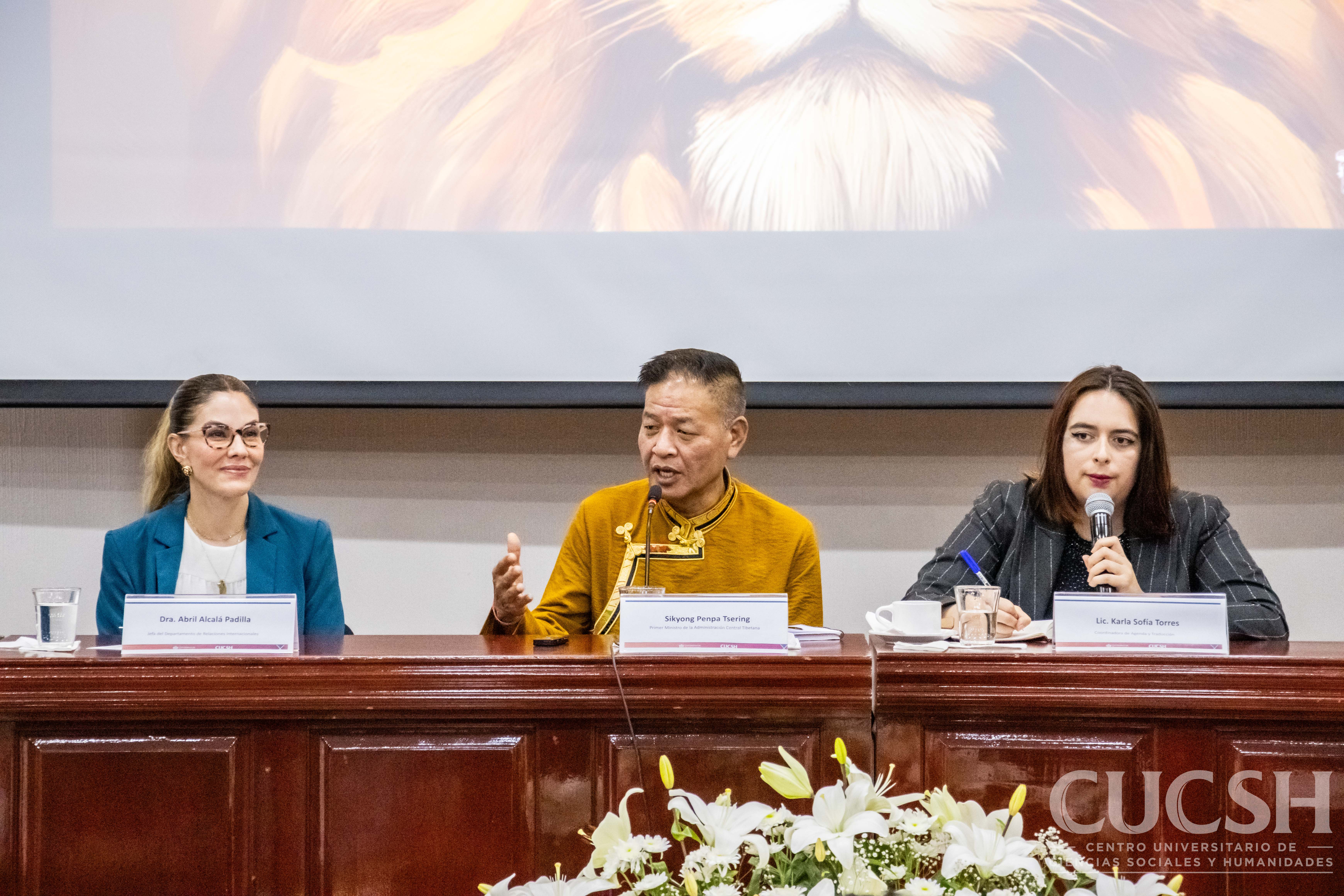 En la mesa del presídium participaron la Dra. Abril Alcalá Padilla, jefa del Departamento de Relaciones Internacionales; la Lic. Carla Sofía Torres, coordinadora de agenda y traducción; y el propio Sikyong Penpa Tsering, representante del gobierno tibetano en el exilio.