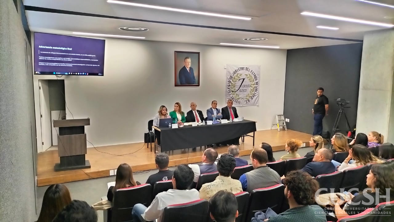 En un ejercicio académico orientado a fortalecer la formación jurídica con enfoque humanista, la División de Estudios Jurídicos del Centro Universitario de Ciencias Sociales y Humanidades (CUCSH), a través del Seminario de Investigación de Derecho Privado y en colaboración con el Ilustre Colegio de Juristas del Estado de Jalisco AC, llevó a cabo la conferencia magistral “Metodología de la investigación con perspectiva de derechos humanos”, en el Auditorio Doctor Adalberto Ortega Solís del Edificio “I” del CUCSH.