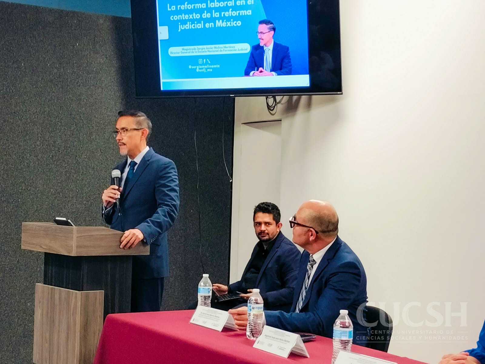 El Centro Universitario de Ciencias Sociales y Humanidades (CUCSH), a través de la División de Estudios Jurídicos y el Departamento de Derecho Social y Disciplina sobre el Derecho, llevó a cabo la conferencia “La reforma laboral en el contexto de la reforma judicial”, impartida por el magistrado Sergio Javier Molina Martínez, director de la Escuela Nacional de Formación Judicial.
