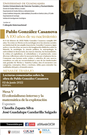 División de Estudios Políticos y Sociales, Departamento de Estudios Ibéricos y Latinoamericanos, Cuerpo Académico Integración, Gobernabilidad y Desarrollo en América Latina y el Caribe, Departamento de Sociología e Instituto de Investigaciones Sociológicas del CUCSH, en el marco del Coloquio Internacional “Pablo González Casanova: A 100 años de su nacimiento”, invitan a la Mesa de Trabajo V: “El colonialismo interno y la matemática de la explotación”. Jueves 02 junio de 2022. 12:00 horas. Transmisión en vivo por https://www.facebook.com/DifundeCUCSH #ComunidadCUCSH