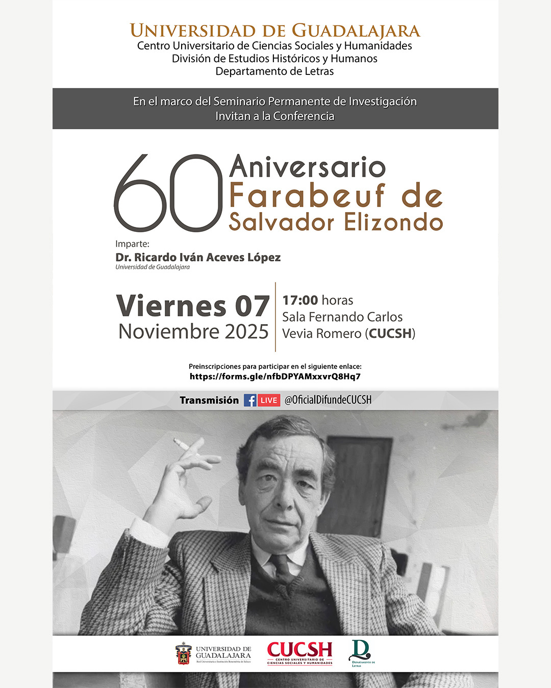 En el marco del Seminario Permanente de Investigación, el Departamento de Letras del Centro Universitario de Ciencias Sociales y Humanidades (CUCSH) de la Universidad de Guadalajara te invita a la conferencia impartida por el Dr. Ricardo Iván Aceves López.