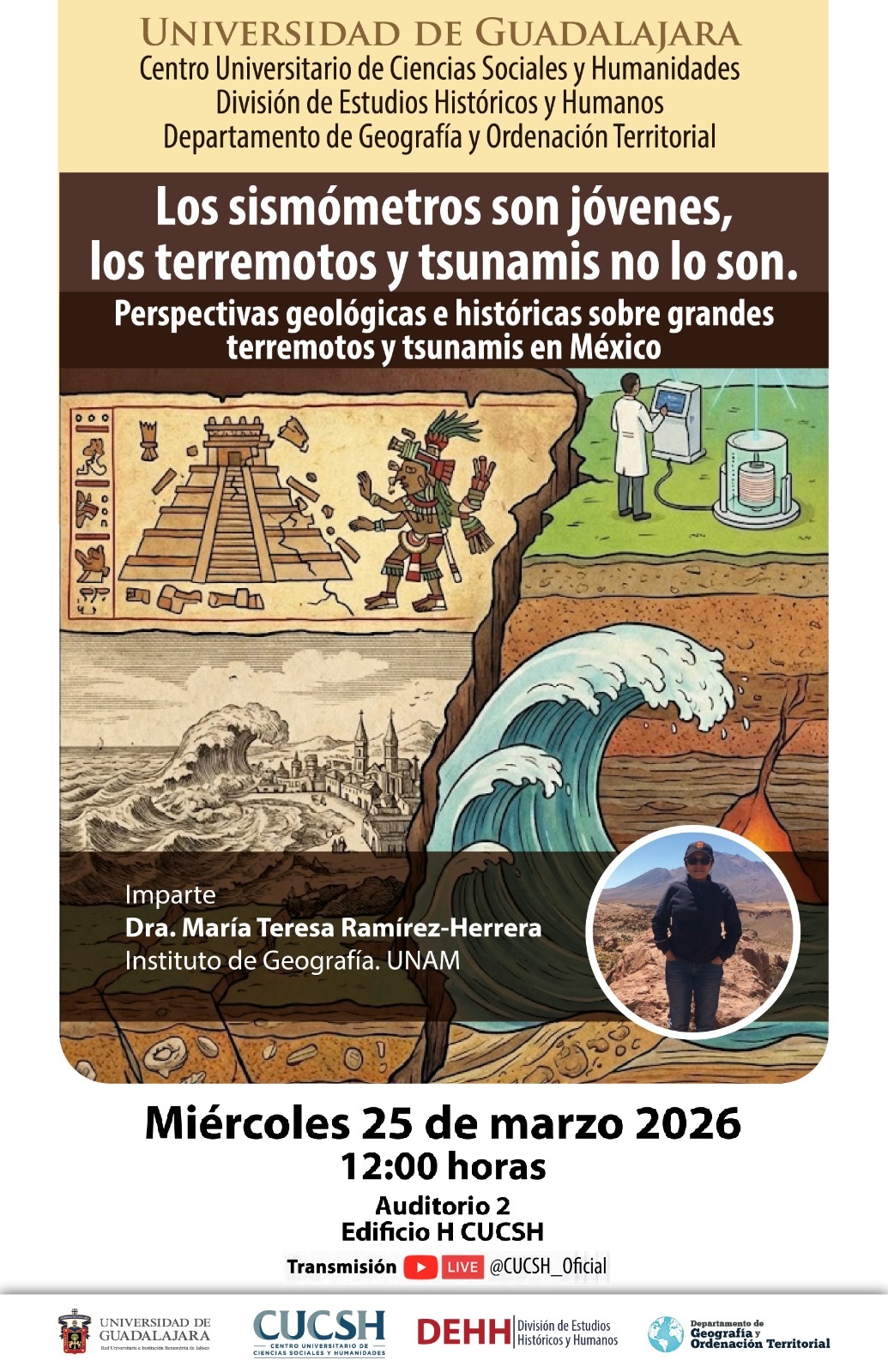 El Departamento de Geografía y Ordenación Territorial del CUCSH te invita a participar en este diálogo sobre las perspectivas geológicas e históricas de los grandes fenómenos naturales en México.