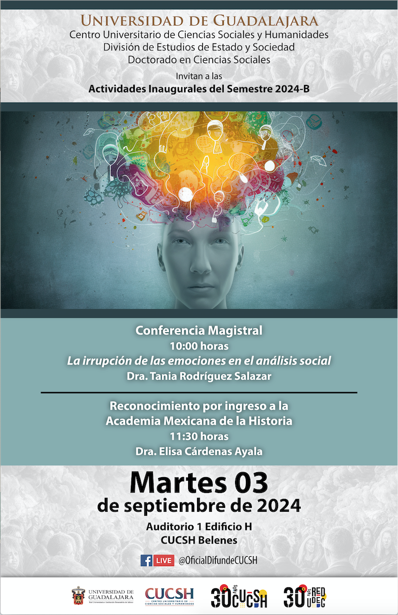 División de Estudios de Estado y Sociedad y Doctorado en Ciencias Sociales del CUCSH, invitan a la Conferencia Magistral Inaugural del Semestre 2024-B: La irrupción de las emociones en el análisis social. Martes 03 septiembre de 2024. 10:00 horas. Reconocimiento a la Dra. Elisa Cárdenas Ayala. 12:00 horas. Auditorio 1 Edificio H CUCSH Belenes. Transmisión en vivo por https://www.facebook.com/OficialDifundeCUCSH #ComunidadCUCSH