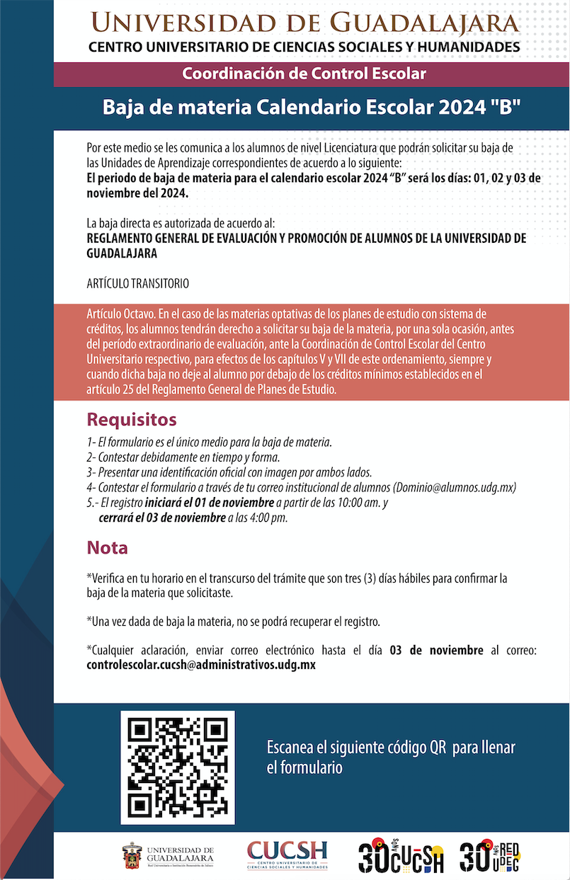 Coordinación de Control Escolar CUCSH informa que el periodo de baja de materia para el Calendario Escolar 2024 "B" son los días: 01, 02 Y 03 de noviembre de 2024.