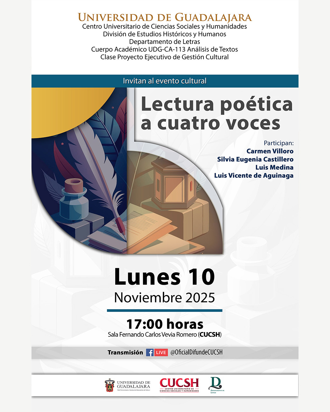 Lugar: Sala Fernando Carlos Vevia Romero (CUCSH)La Universidad de Guadalajara, a través del Centro Universitario de Ciencias Sociales y Humanidades (CUCSH), te invita a disfrutar de una tarde llena de poesía, sensibilidad y reflexión. ¡No te pierdas este encuentro con la palabra y la emoción poética!