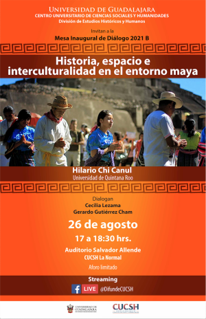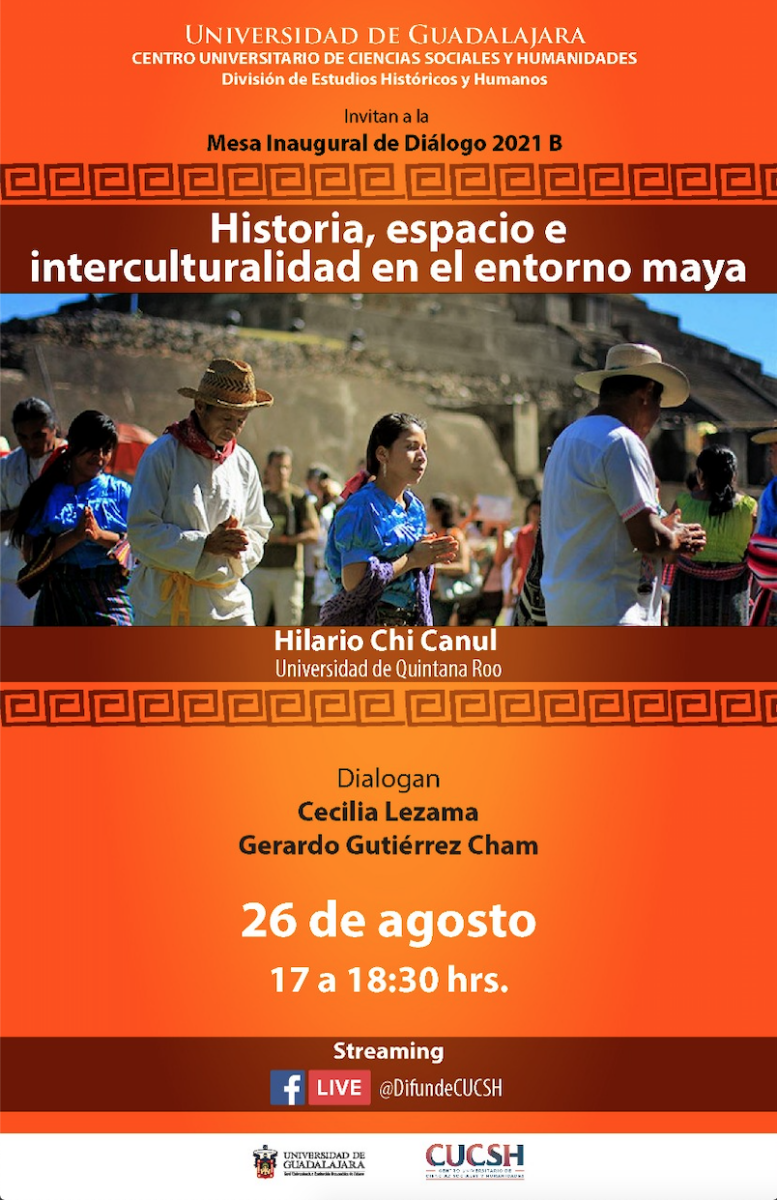 División de Estudios Históricos y Humanos del CUCSH, invita a la Mesa Inaugural de Diálogo 2021-B “Historia, espacio e interculturalidad en el entorno maya”. Jueves de 26 agosto 2021. 17:00 horas. Transmisión en vivo por https://www.facebook.com/DifundeCUCSH #ComunidadCUCSH