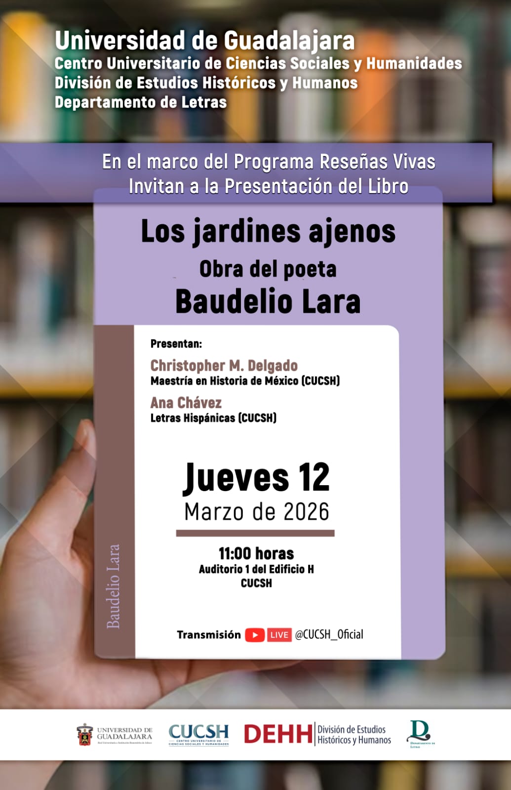 La Universidad de Guadalajara, a través del CUCSH y el Departamento de Letras, invita a la presentación del libro Los jardines ajenos, obra del poeta Baudelio Lara, en el marco del programa Reseñas Vivas.
