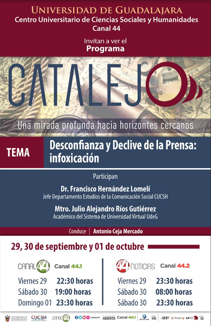 Centro Universitario de Ciencias Sociales y Humanidades y Canal 44, invitan al Programa Catalejo: coproducción de Canal 44 y CUCSH. Tema de esta semana: Desconfianza y Declive de la Prensa: infoxicación. Viernes, Sábado y Domingo. Canal 44.1 y Canal 44.2 #ComunidadCUCSH Revisa los horarios de transmisión aquí