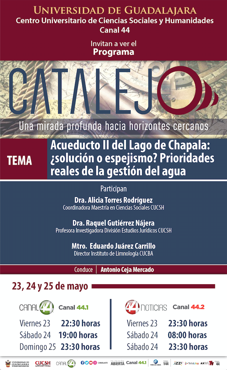 Centro Universitario de Ciencias Sociales y Humanidades y Canal 44, invitan al Programa Catalejo: coproducción de Canal 44 y CUCSH. Tema de esta semana: Acueducto II del Lago de Chapala: ¿solución o espejismo? Prioridades reales de la gestión del agua. Viernes, Sábado y Domingo. Canal 44.1 y Canal 44.2 #ComunidadCUCSH Revisa los horarios de transmisión aquí
