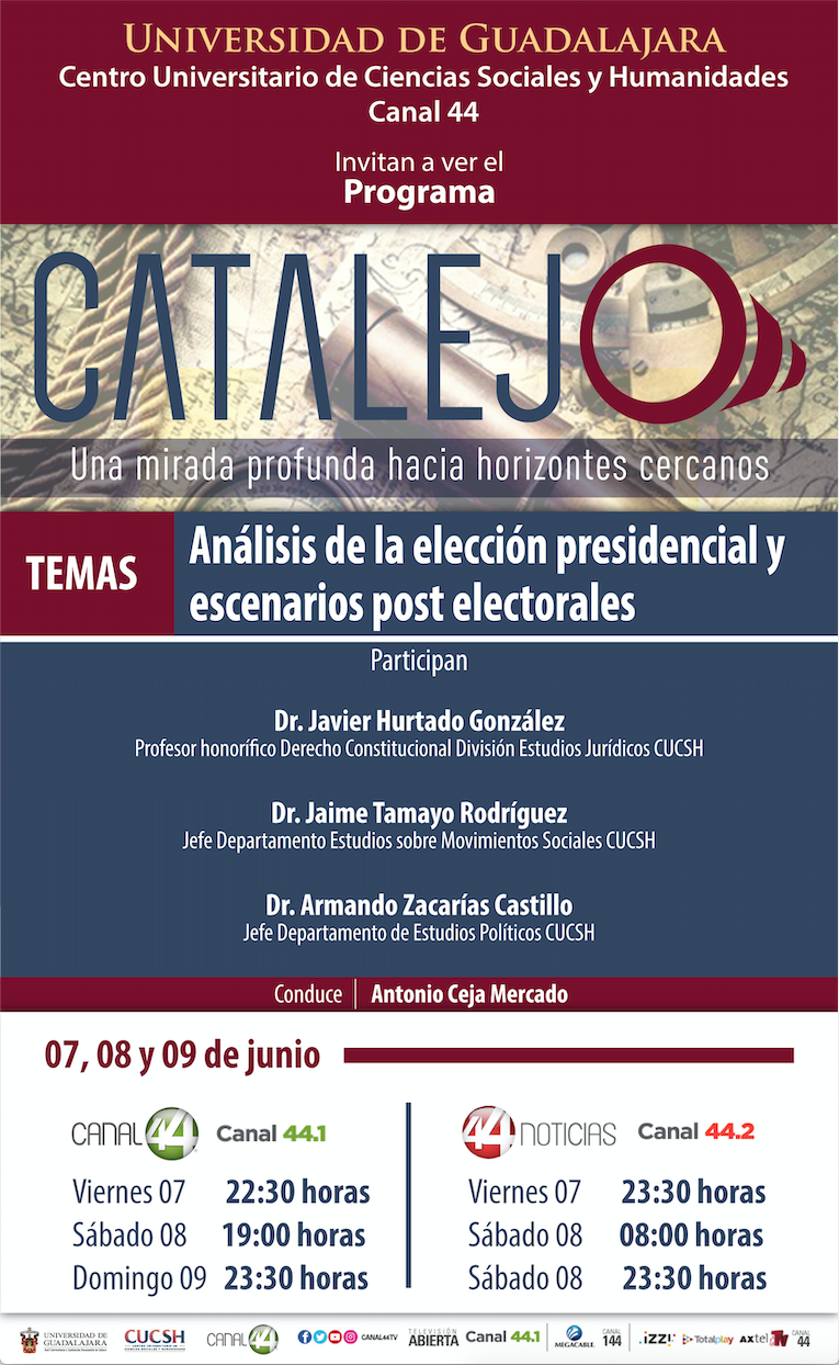 Centro Universitario de Ciencias Sociales y Humanidades y Canal 44, invitan al Programa Catalejo: coproducción de Canal 44 y CUCSH. Temas de esta semana: Análisis de la elección presidencial y escenarios post electorales. Viernes, Sábado y Domingo. Canal 44.1 y Canal 44.2 #ComunidadCUCSH Revisa los horarios de transmisión aquí