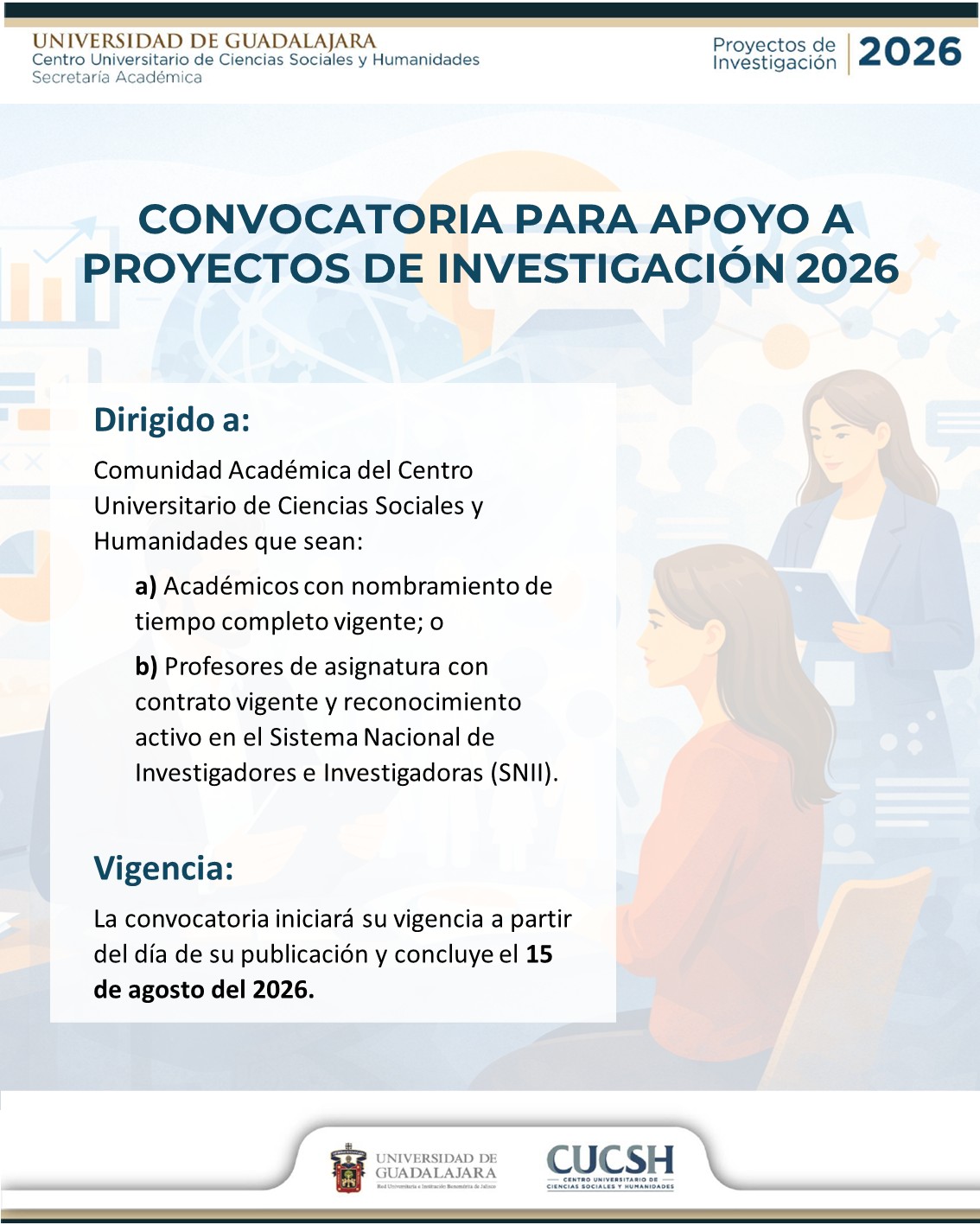La presente convocatoria de Apoyo a Proyectos de Investigación 2026 del Centro Universitario de Ciencias Sociales y Humanidades (CUCSH) se fundamenta en la necesidad de fortalecer la investigación como una actividad estratégica para el desarrollo nacional, regional e institucional. En México, el derecho de toda persona a gozar de los beneficios del desarrollo de la ciencia y la innovación se encuentra reconocido en el artículo 3º de la Constitución Política de los Estados Unidos Mexicanos (2025), el cual establece la obligación del Estado de apoyar la investigación científica, humanística y tecnológica, así como de fomentar las Humanidades, Ciencias, Tecnologías e Innovación (HCTI).