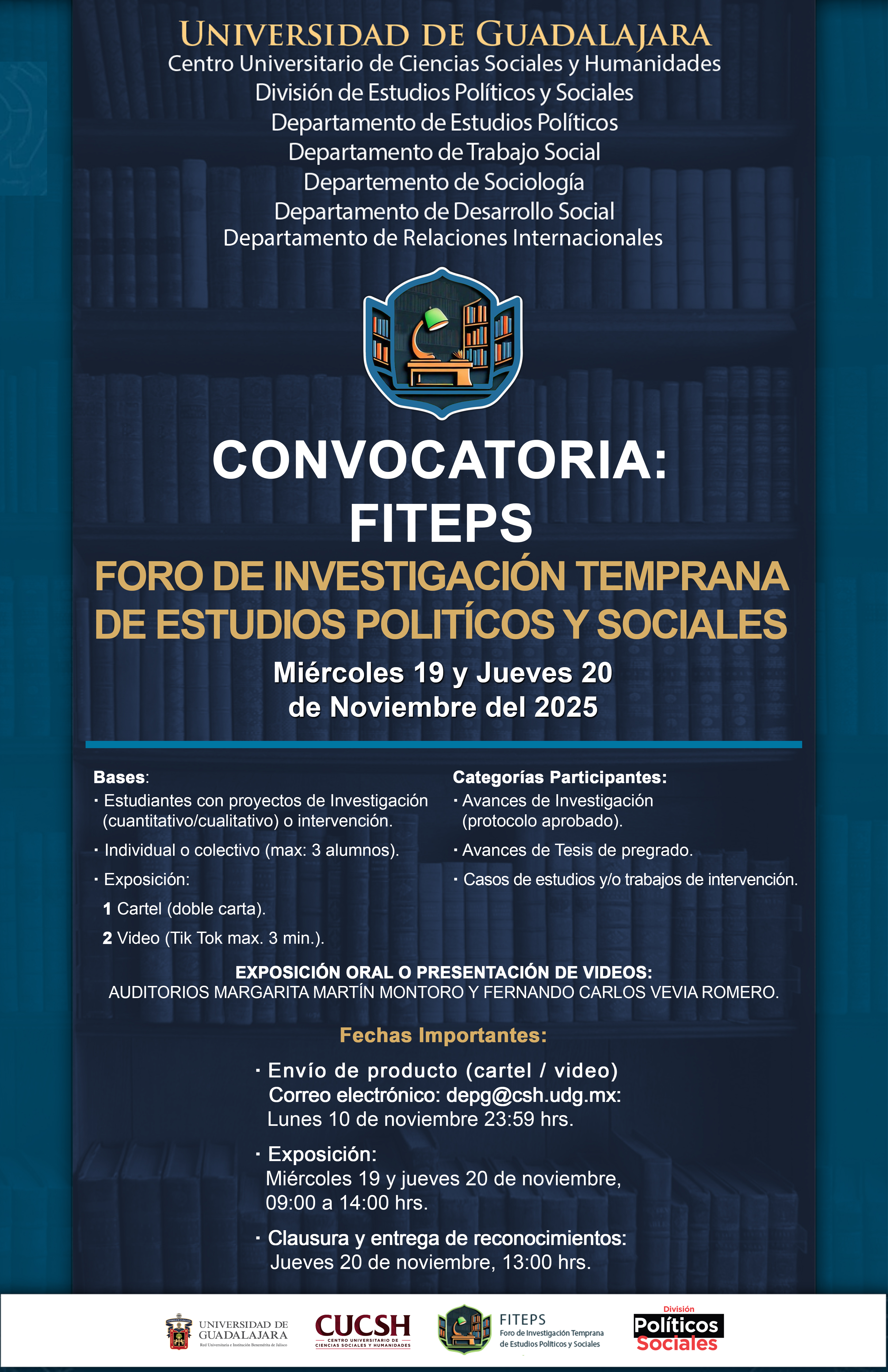 El Centro Universitario de Ciencias Sociales y Humanidades (CUCSH) de la Universidad de Guadalajara, a través de la División de Estudios Políticos y Sociales, lanzó la convocatoria al Foro de Investigación Temprana de Estudios Políticos y Sociales (FITEPS), que se realizará los días 19 y 20 de noviembre de 2025 en los auditorios Margarita Martín Montoro y Fernando Carlos Vevia Romero.