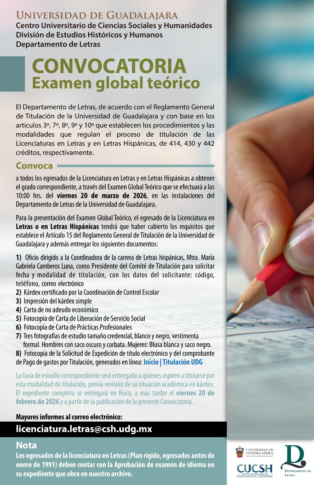 El Departamento de Letras de la Universidad de Guadalajara invita a las y los egresados de Letras y Letras Hispánicas a titularse mediante el Examen Global Teórico.