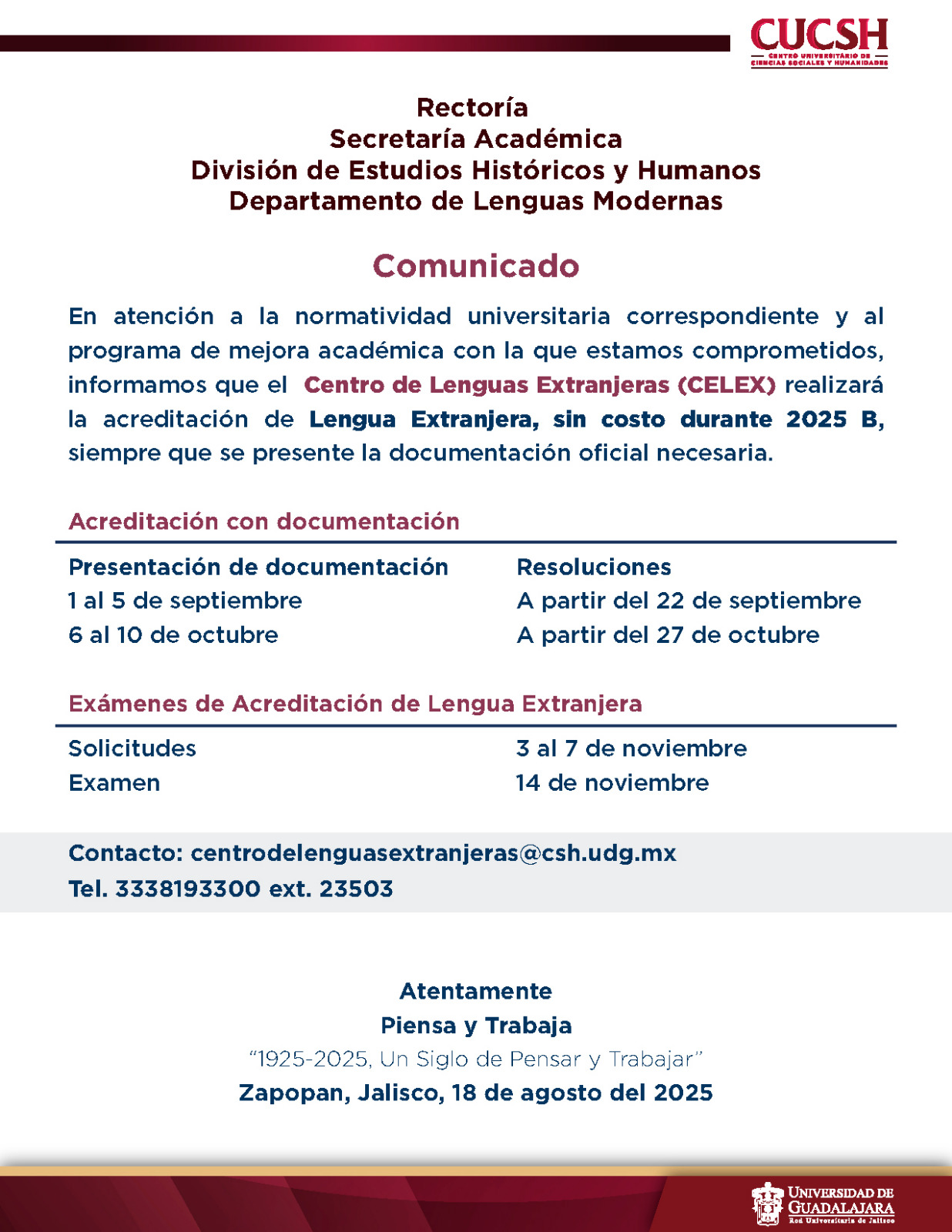 En correspondencia con la normatividad correspondiente y el programa de mejora académica con la que estamos comprometidos, informamos que el Centro de Lenguas Extranjeras (CELEX) realizará la acreditación de Lengua Extranjera, sin costo durante 2025 B, siempre que se presente la documentación oficial correspondiente.