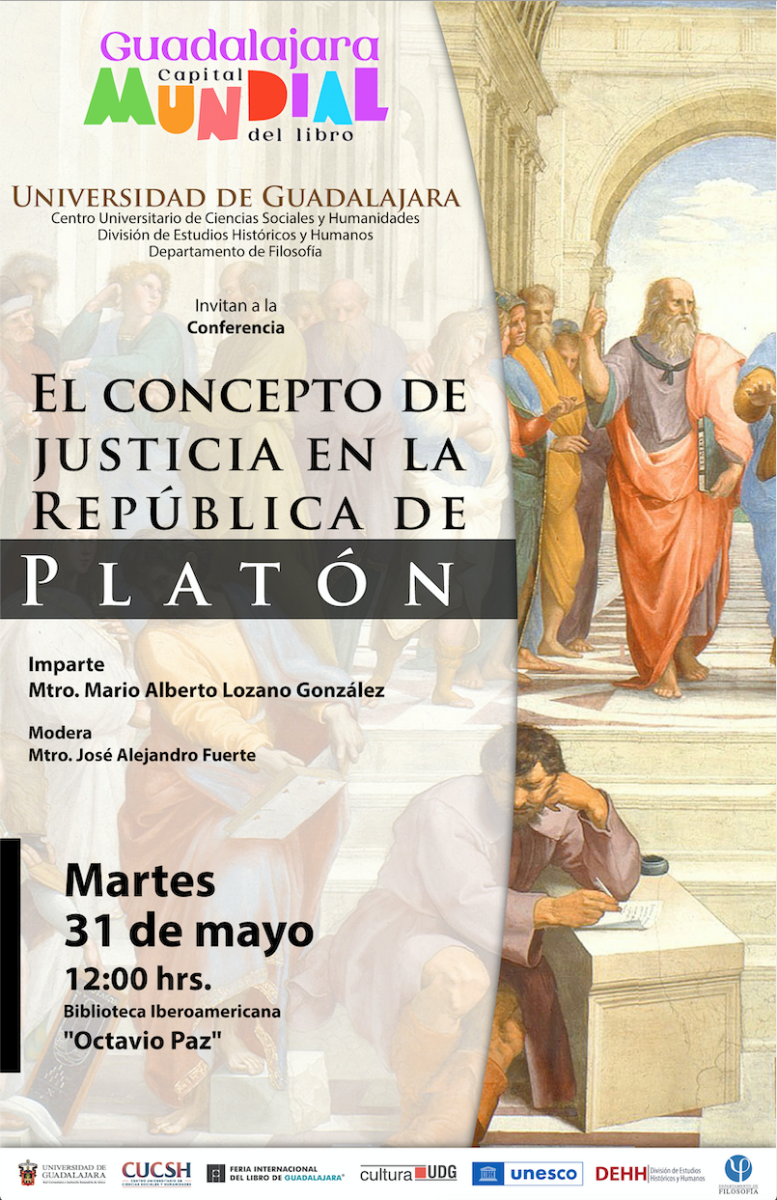 División de Estudios Históricos y Humanos y Departamento de Filosofía del CUCSH, en el marco de Guadalajara Capital Mundial del Libro, invitan a la Conferencia: “El concepto de justicia en la república de Platón”. Martes 31 mayo de 2022.  12:00 a 14:00 horas. Biblioteca Iberoamericana “Octavio Paz”. Entrada libre #ComunidadCUCSH