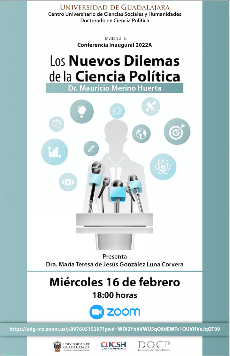 Doctorado en Ciencia Política del CUCSH invita a la Conferencia Inaugural 2022-A: “Los Nuevos Dilemas de la Ciencia Política”. Miércoles 16 febrero de 2022. 18:00 horas. Transmisión en vivo Plataforma Zoom #ComunidadCUCSH