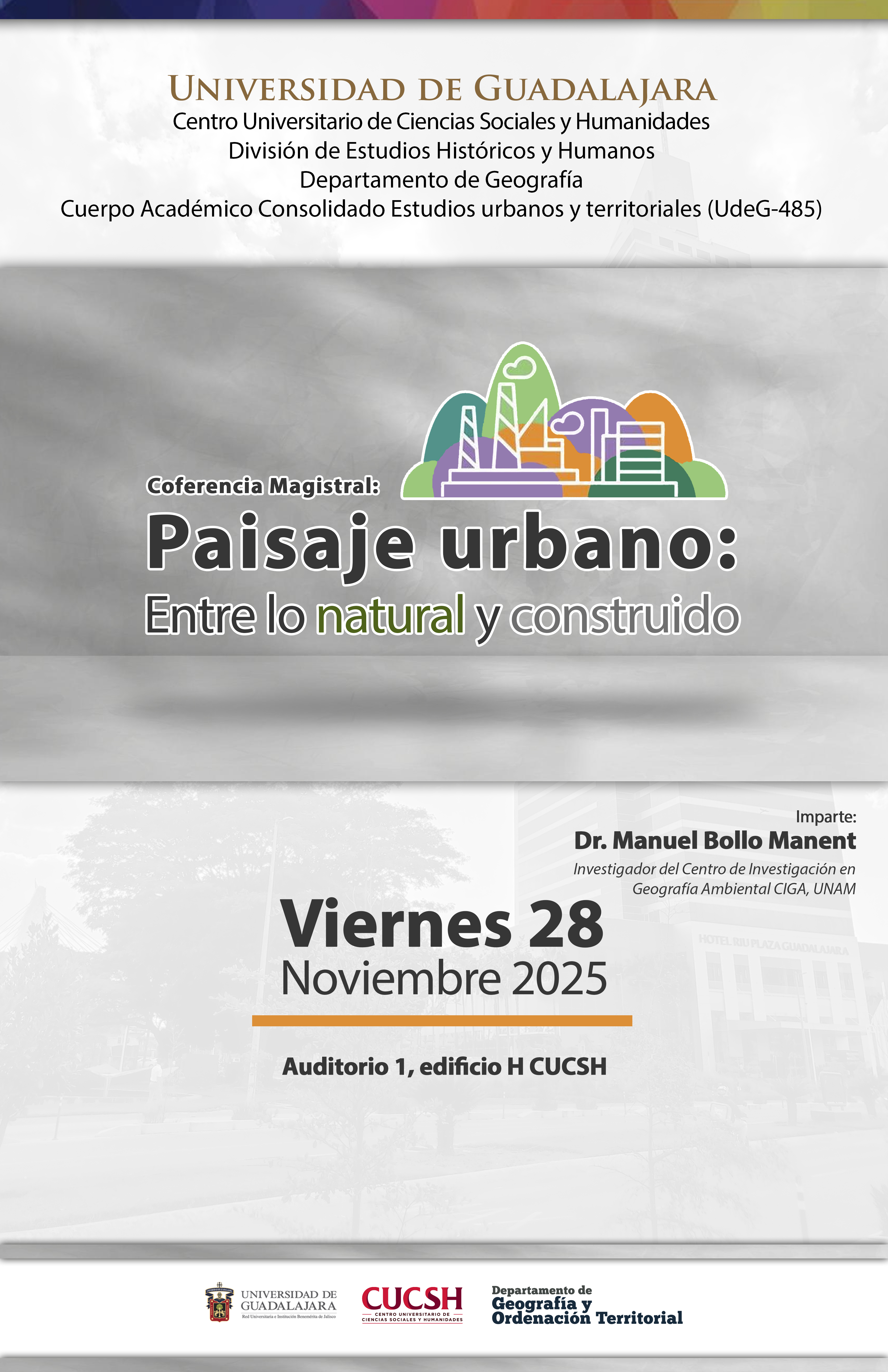 El encuentro, organizado por la División de Estudios Históricos y Humanos, el Departamento de Geografía y Ordenación Territorial, la Maestría en Desarrollo Local y Territorio y el Cuerpo Académico Consolidado “Estudios Urbanos y Territoriales” (UdeG-485), invitan a estudiantes, académicos y especialistas interesados en comprender la compleja relación entre las transformaciones del entorno urbano y los procesos naturales que lo configuran.