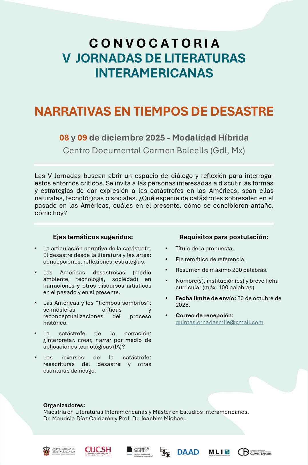 La Maestría en Literaturas Interamericanas del Centro Universitario de Ciencias Sociales y Humanidades (CUCSH) de la Universidad de Guadalajara, en colaboración con el Máster en Estudios Interamericanos de la Universidad de Bielefeld, convoca a investigadores, estudiantes y docentes a participar en las V Jornadas de Literaturas Interamericanas, que se llevarán a cabo los días 8 y 9 de diciembre de 2025, en modalidad híbrida desde el Centro Documental Carmen Balcells (Guadalajara, México).