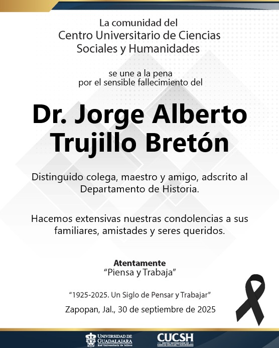 La comunidad del Centro Universitario de Ciencias Sociales y Humanidades lamenta profundamente el sensible fallecimiento del Dr. Jorge Alberto Trujillo Bretón, distinguido colega, maestro y amigo, adscrito al Departamento de Historia.
