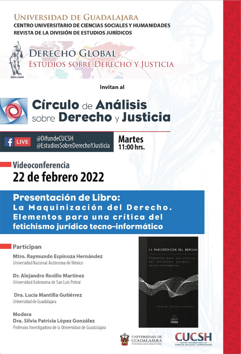 Revista Derecho Global. Estudios sobre Derecho y Justicia del CUCSH, invita al Círculo de Análisis sobre Derecho y Justicia y a la presentación del libro” La Maquinización del Derecho. Elementos para una crítica del fetichismo jurídico tecno-informático”. Martes 22 febrero de 2022. 11:00 horas. Transmisión en vivo por https://www.facebook.com/EstudiosSobreDerechoYJusticia y por https://www.facebook.com/DifundeCUCSH #ComunidadCUCSH