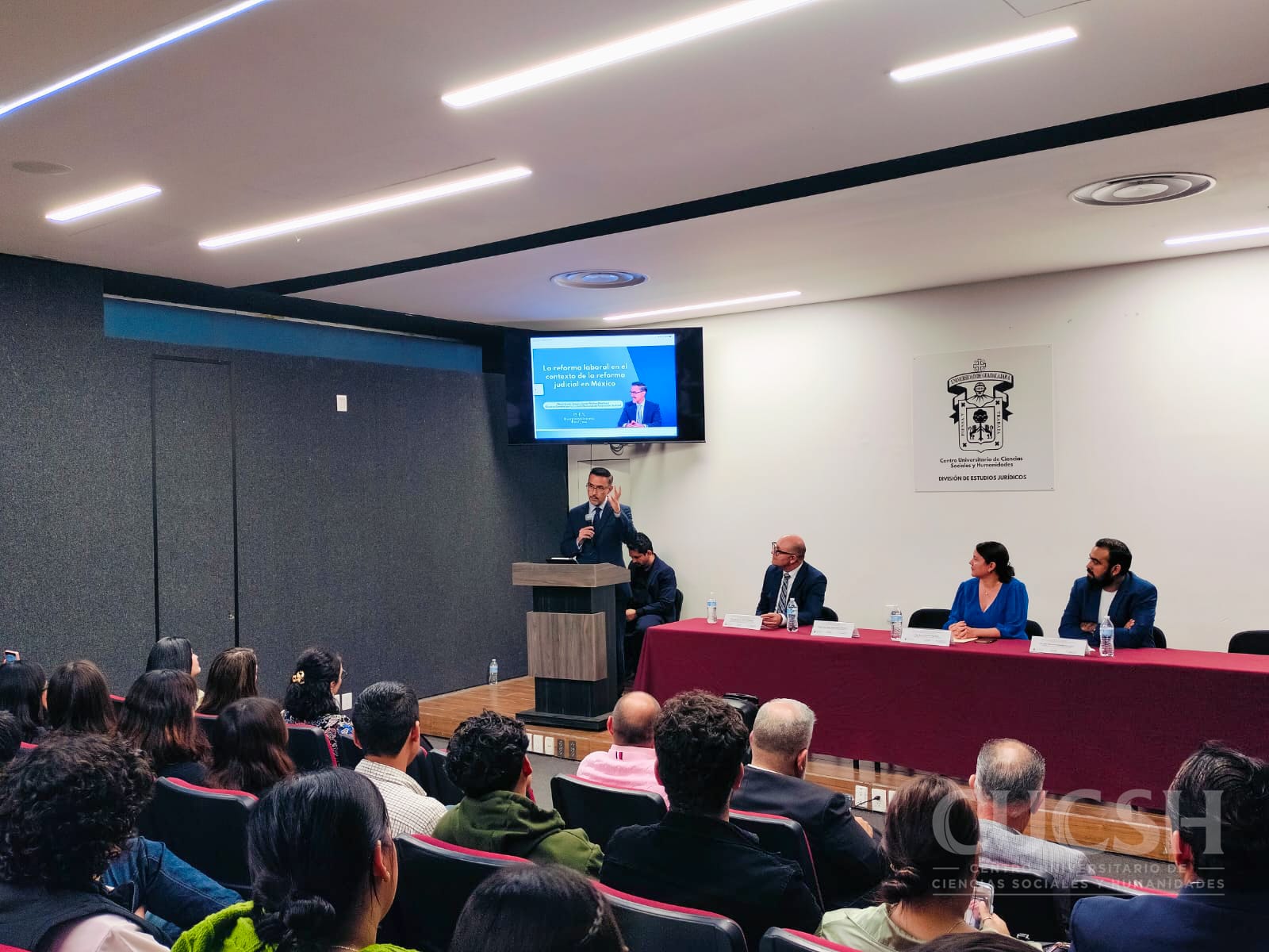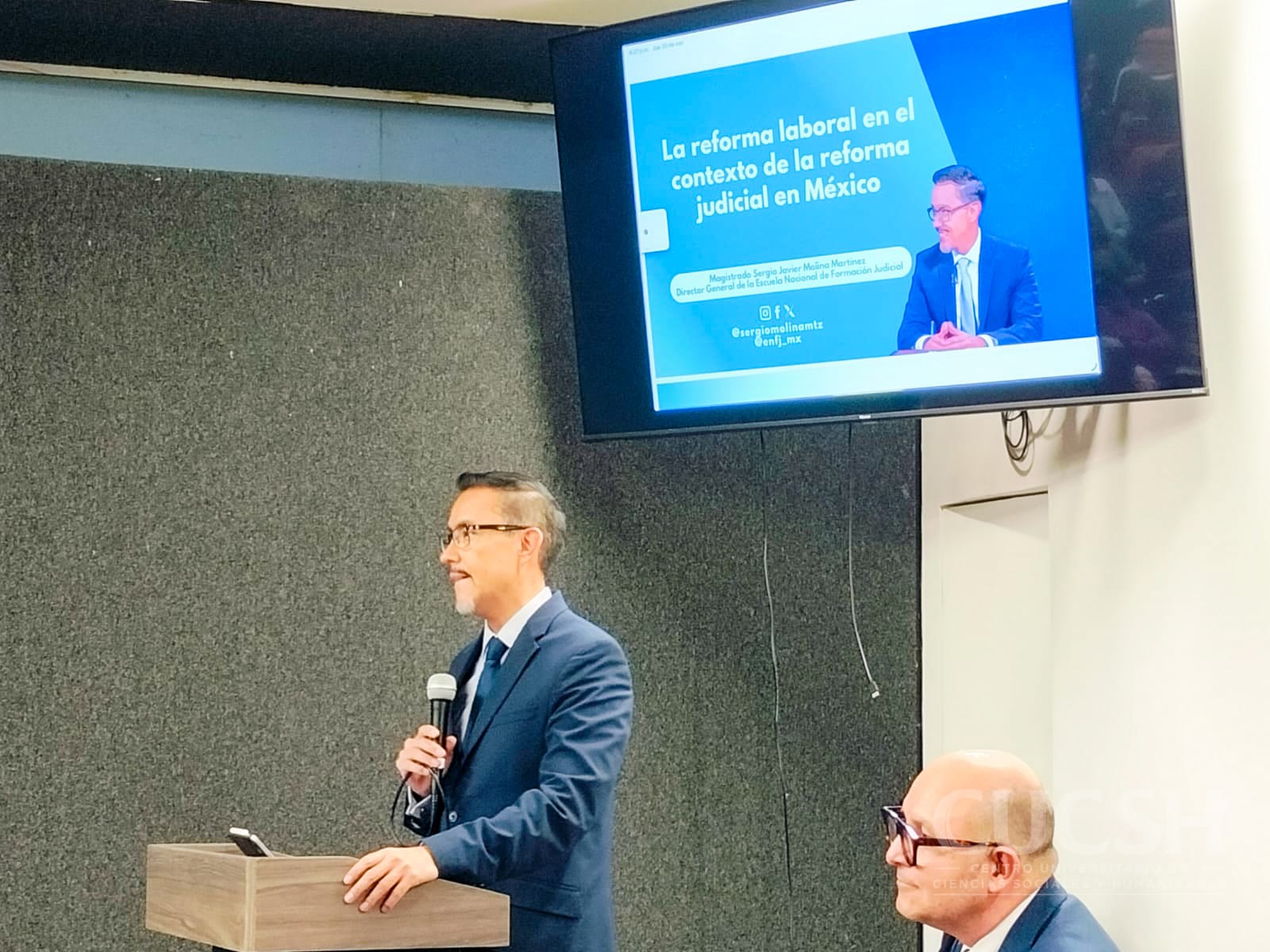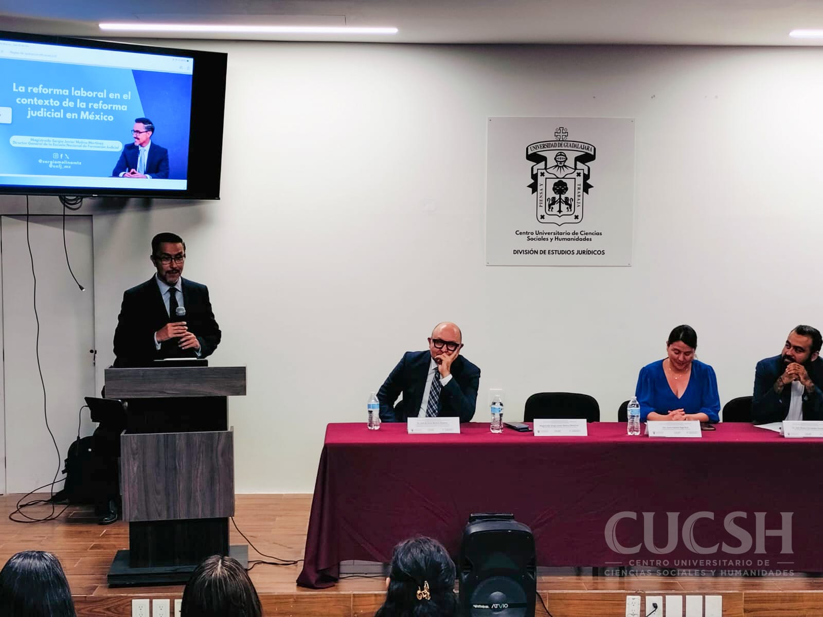 El Centro Universitario de Ciencias Sociales y Humanidades (CUCSH), a través de la División de Estudios Jurídicos y el Departamento de Derecho Social y Disciplina sobre el Derecho, llevó a cabo la conferencia “La reforma laboral en el contexto de la reforma judicial”, impartida por el magistrado Sergio Javier Molina Martínez, director de la Escuela Nacional de Formación Judicial.